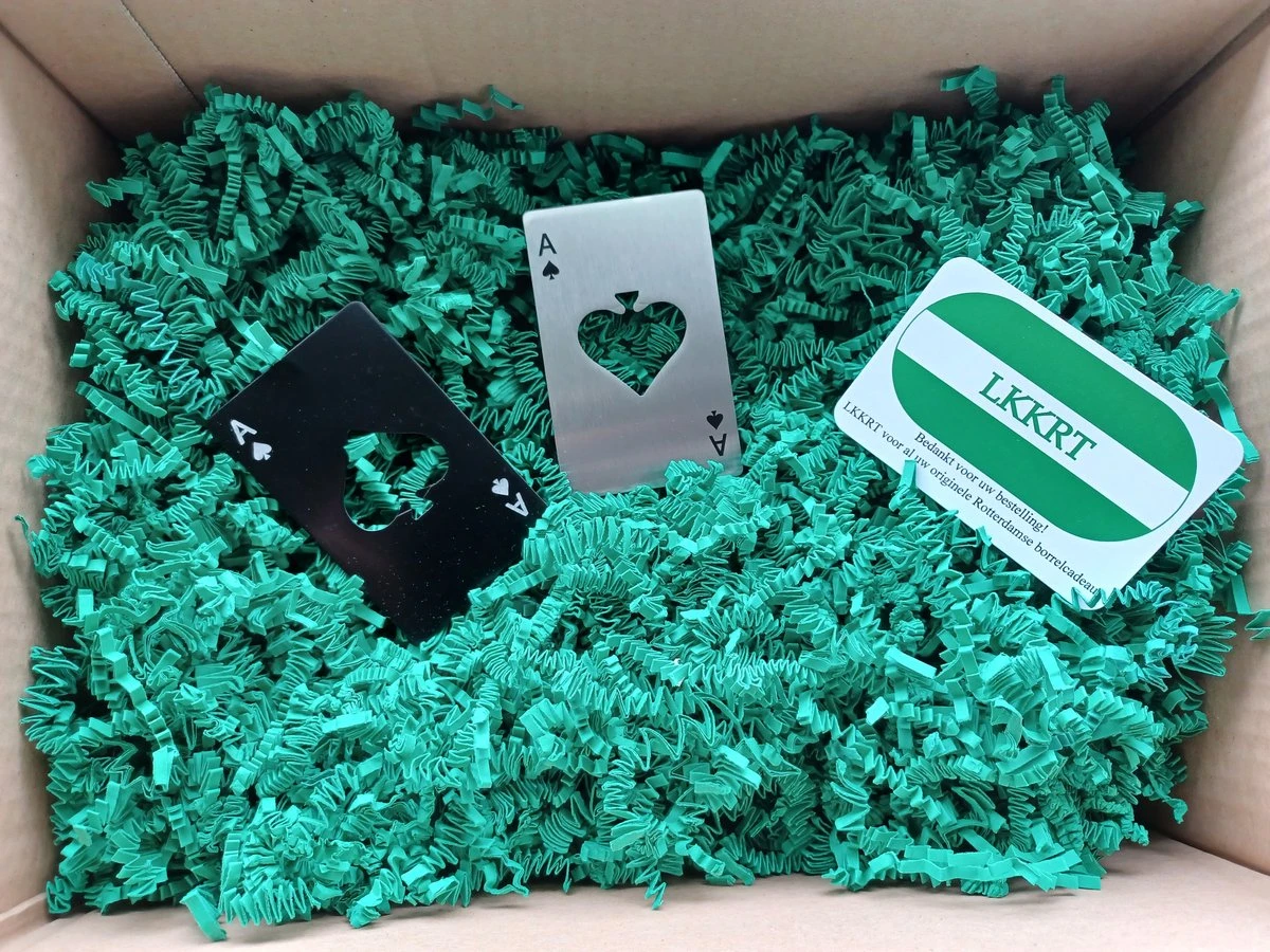 | Verpakkingsinhoud | Het aantal bestelde openers, met voldoende verpakkingsmateriaal. Verpakkingsmateriaal is in de kleuren van ons logo volledig aangekleed van binnen. |