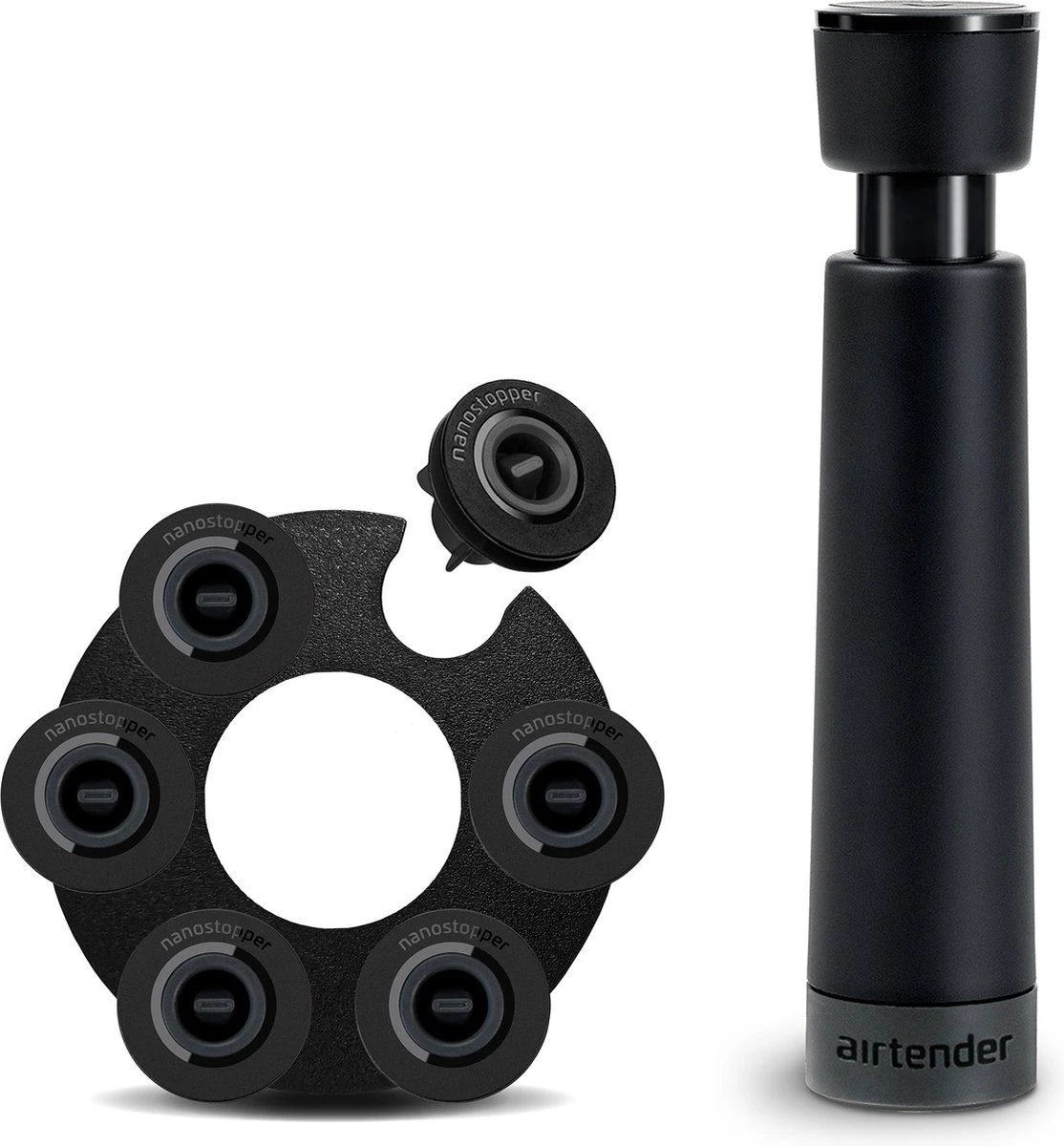 Houd wijn langer vers en perfect op smaak met deze extra uitgebreide Airtender set in mooie milieuvriendelijke kraft kartonnen geschenkverpakking. Bewaar open flessen lekvrij liggend onder vacuüm in wijnrek, koeling of klimaatkast (1x Airtender vacuümpomp, 6x Nanostopper, 1 x Bewaarclip).
