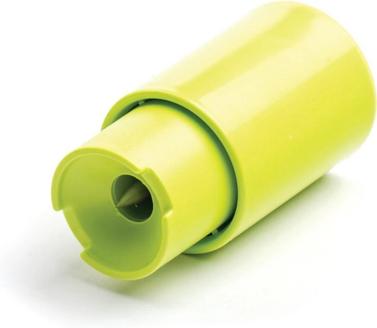 “Prikit”. Perforeert eenvoudig kroonkurken en blikjes met een ø6,5 mm gat. Een rietje door het gat steken houdt insecten uit de drank. Vermindert morsen als een drankje omvalt. Geschikt voor 6 mm biologisch afbreekbare rietjes.
