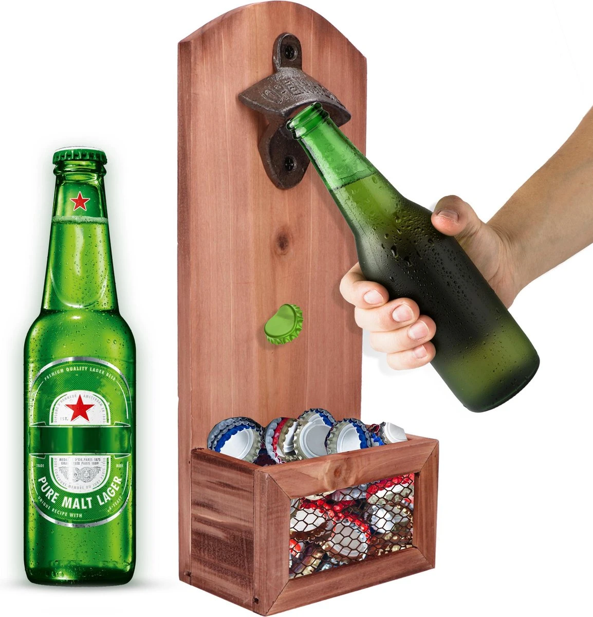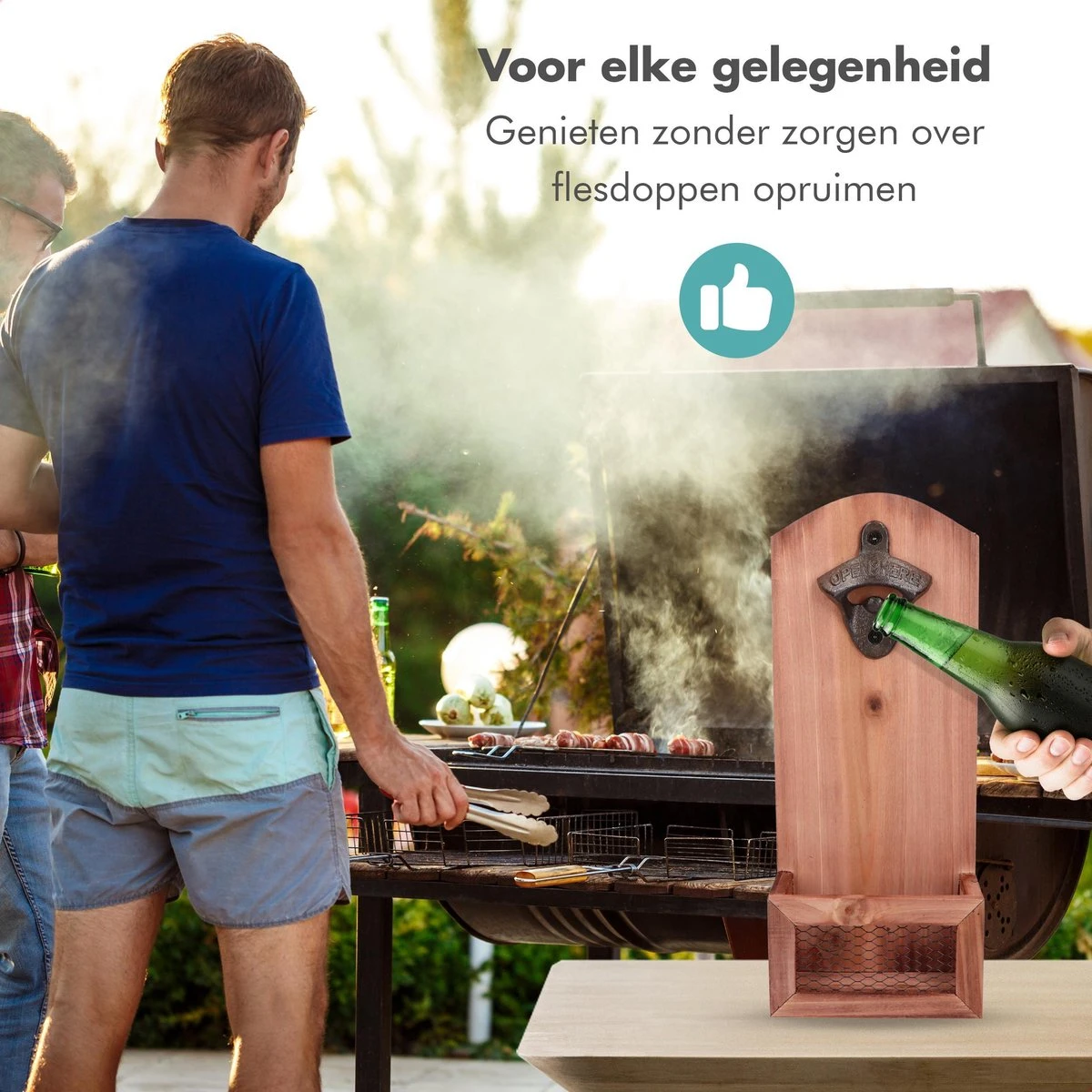 Ben jij het zat om elke keer het dopje van een fles apart weg te gooien? Daar is gelukkig een oplossing voor! Met deze bieropener/flesopener aan de muur hoeft dat niet meer. De handige opvangbak vangt namelijk ca. 50 dopjes op.