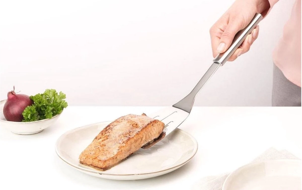 Een stijlvolle keuken met een Brabantia Profile Bakspaan. Overtollig braadvet hoort niet bij een lekkere maaltijd. Deze bakspaan, van veerkrachtig roestvrij staal, is zo gemaakt dat het teveel aan vet door de sleuven weg kan.