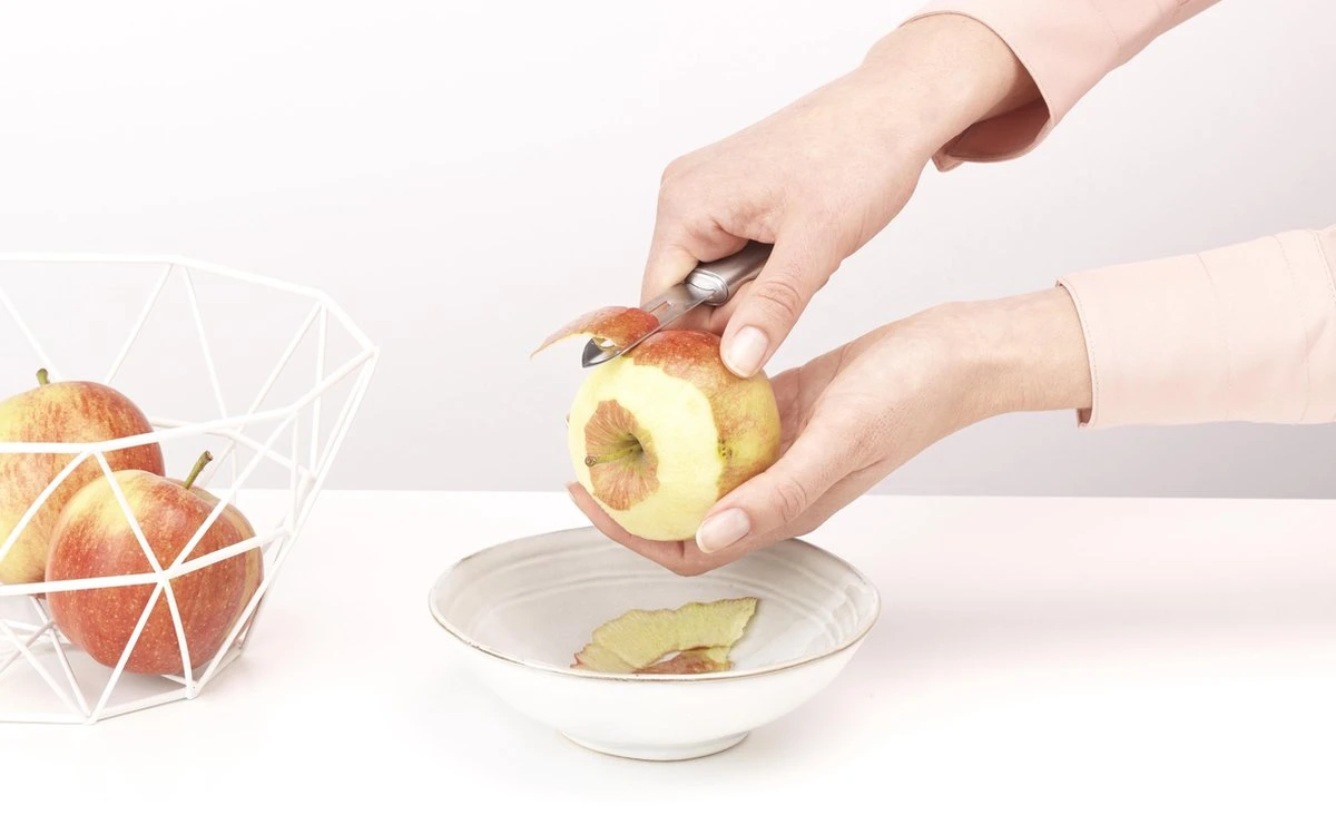 Aardappelen, appels, peren en komkommers schillen met een gewoon keukenmesje? Neem de Brabantia Profile Dunschiller, ideaal voor het ‘zuinig’ schillen. Met dubbelzijdig geslepen hardstalen mes en ‘ontpitter‘.