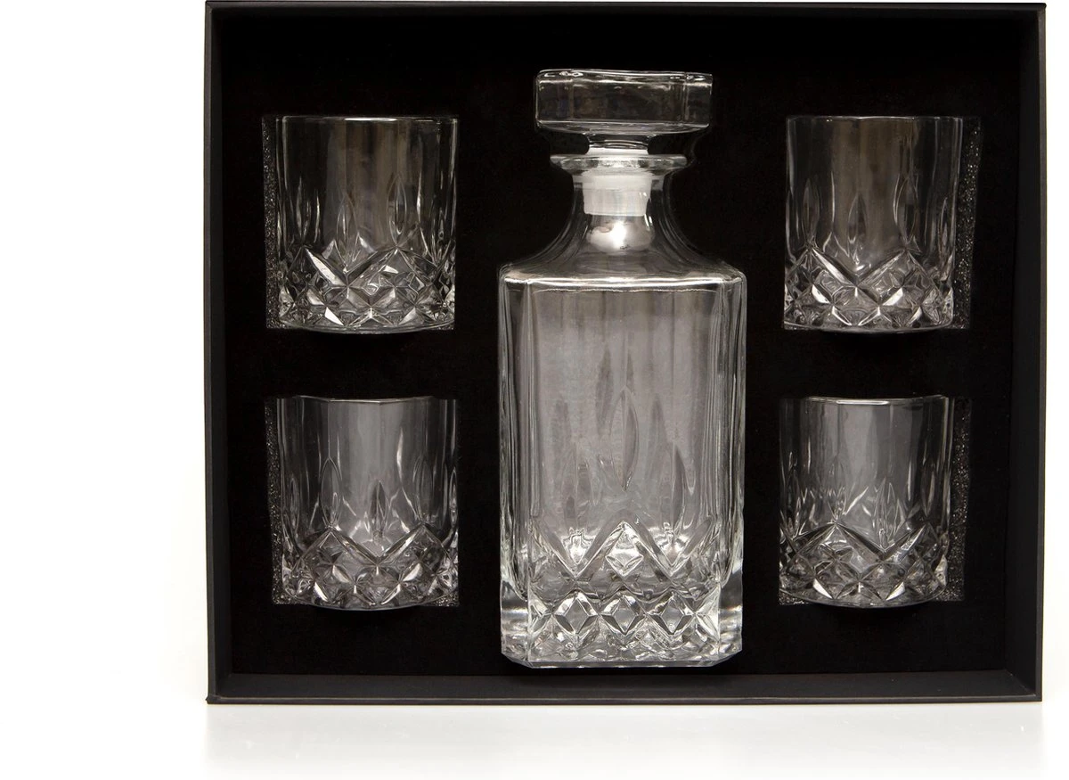 Deze prachtige whiskey set van 1 karaf en 4 whiskey glazen is gemaakt van kristalglas. De set wordt geleverd in een luxe geschenkdoos, dit maakt het een prachtig cadeau om te geven, te krijgen of gewoon voor jezelf.