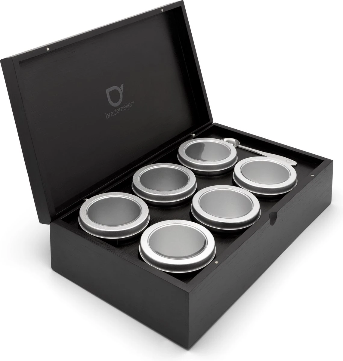 Bewaar je losse thee op stijlvolle wijze met deze zwarte Bredemeijer® theedoos. De theedoos is voorzien van 6 ronde blikjes en speciaal ontwikkeld voor het bewaren van losse thee. Zo blijft de thee langer houdbaar en blijft de smaak behouden.