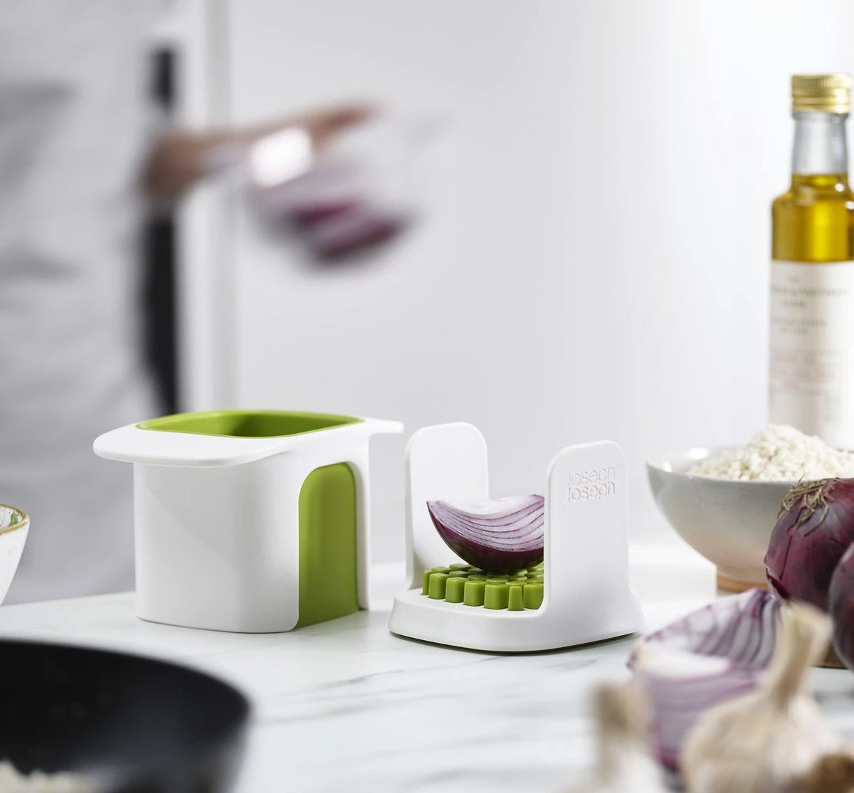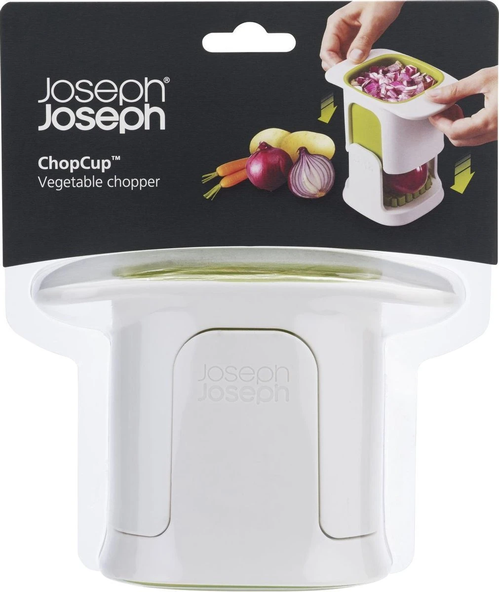 Ben je altijd lang bezig om alle groenten te snijden en zoek je een snellere oplossing? Met de ChopCup groentesnijder van Joseph Joseph kun je voortaan op een snelle en nette manier allerlei soorten groente in blokjes snijden. Van ui en knoflook tot aardappel en wortel. De scherpe RVS snijbladen snijden overal moeiteloos doorheen terwijl de speciale houder de gesneden ingrediënten verzamelt. De gesneden ingrediënten kunnen vervolgens vanuit de houder meteen de pan in. De onderdelen van de groentesnijder zijn eenvoudig uit elkaar te halen, wat het schoonmaken extra makkelijk maakt.