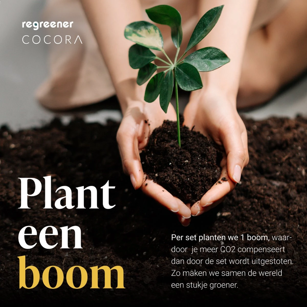 - 1 set = 1 boom – per set planten we één boom, zo ‘overcompenseren’ we onze COâ‚‚ uitstoot en maken we samen de wereld een beetje groener