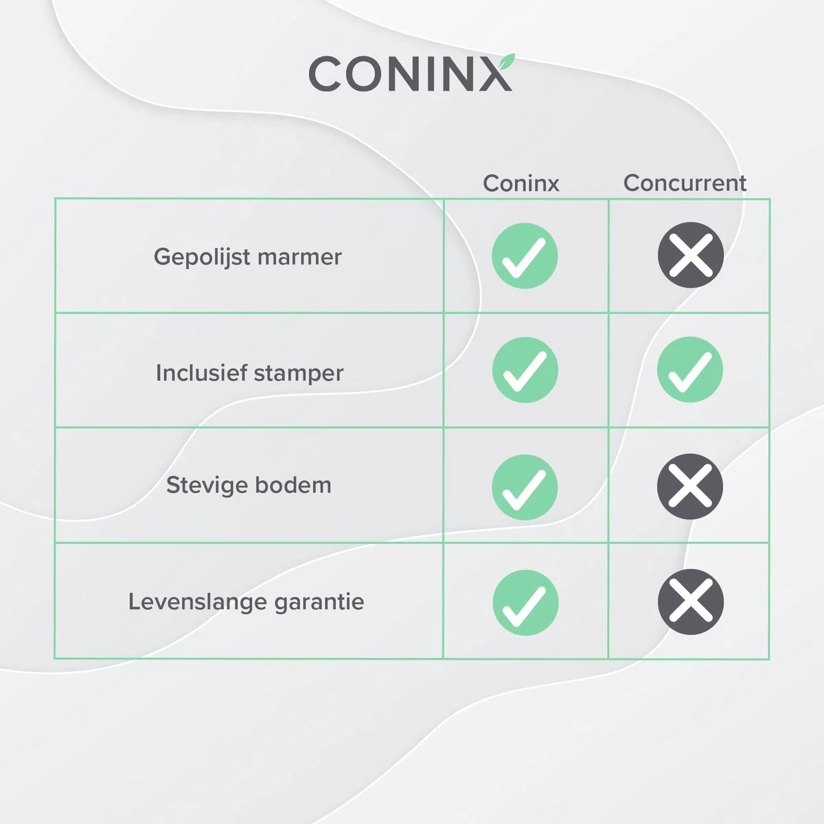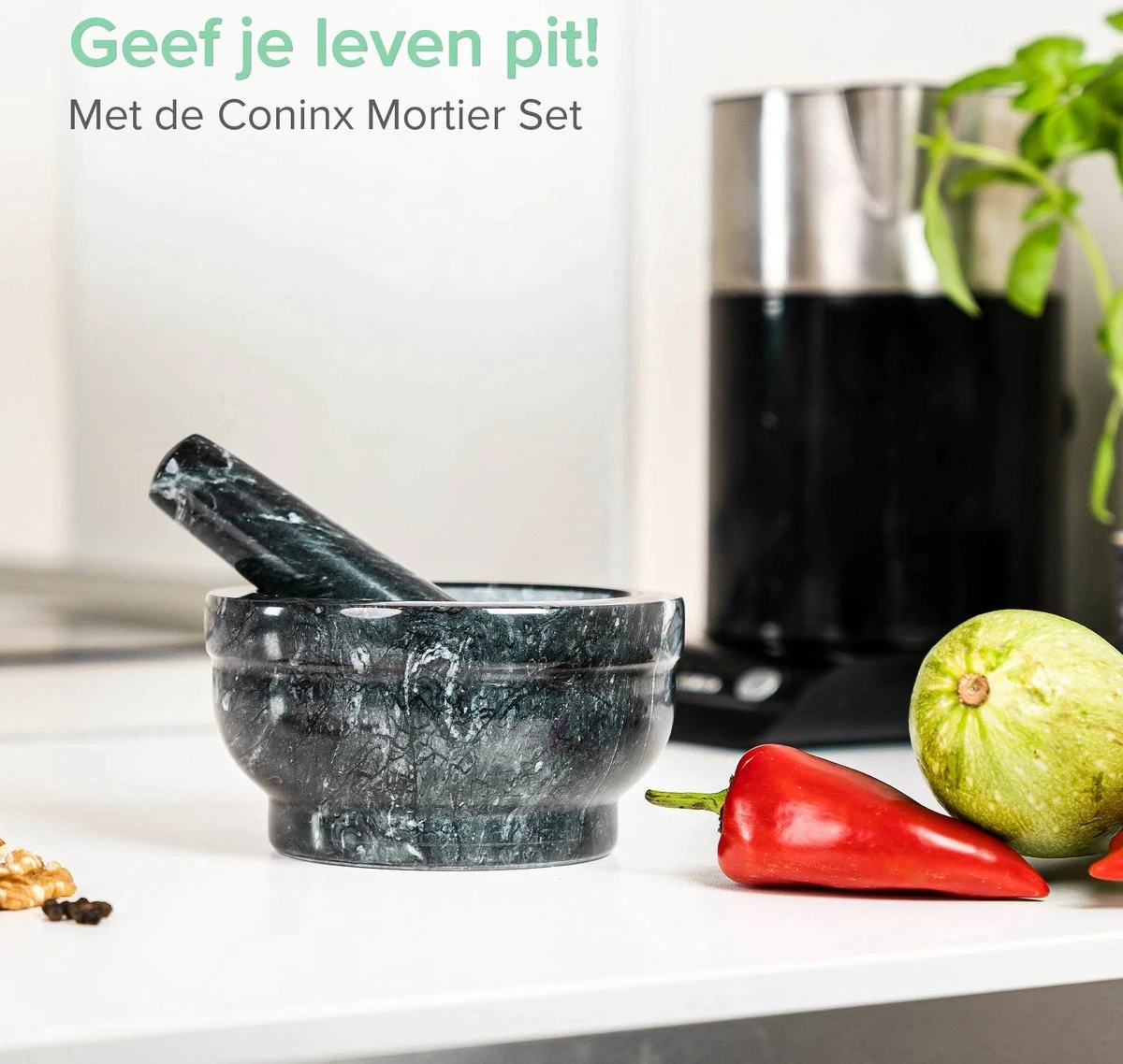 Kook je graag met verse kruiden en ingrediënten? Dan is deze Coninx vijzel inclusief stamper een onmisbaar item in de keuken! Dankzij het harde marmer is het fijn malen of stampen van je ingrediënten zeer eenvoudig. Alle geuren en smaken komen optimaal vrij. Deze vijzel heeft een ruwe binnenkant en is van de buitenzijde gepolijst.