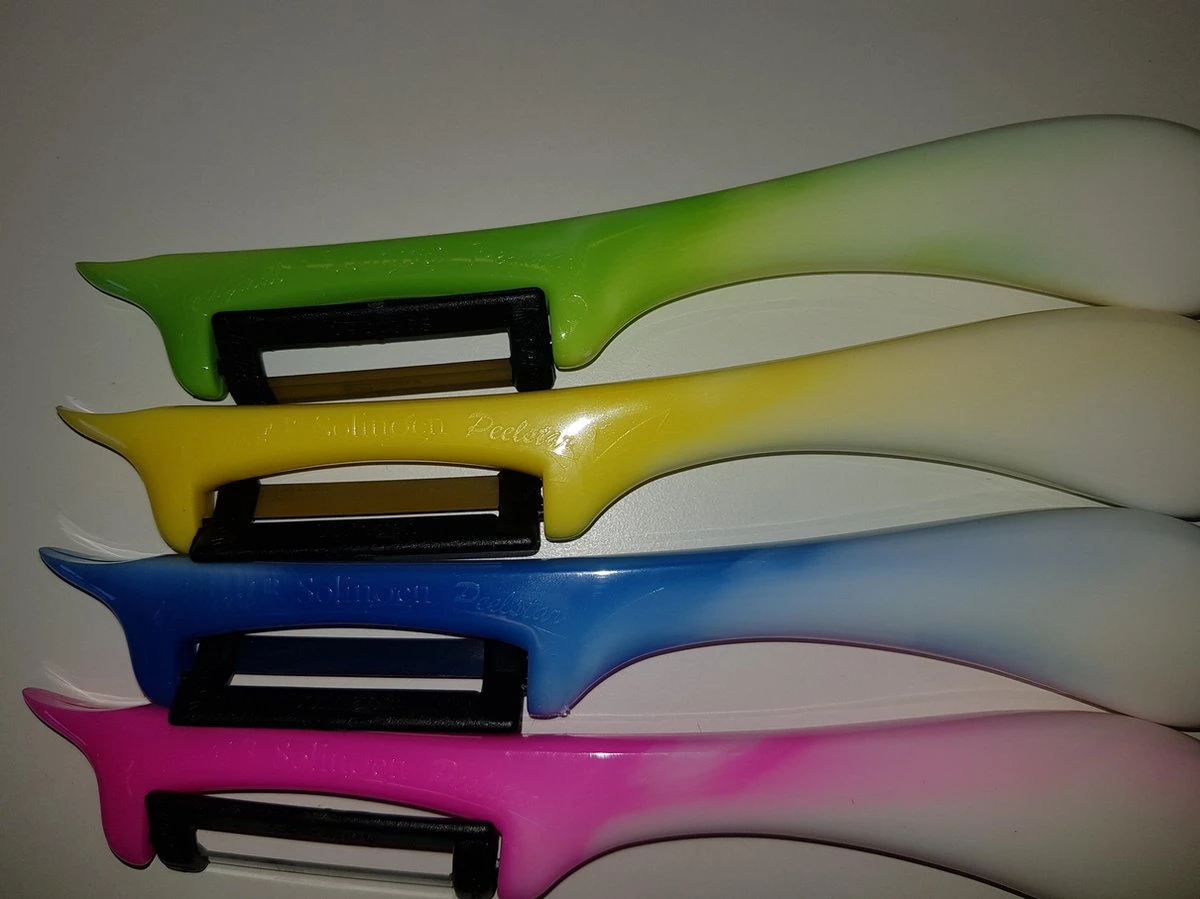 - Handig kunststof handvat in de huidige trendkleuren: lichtblauw, zwart, lichtgroen, roze, geel, rood, oranje, elk gemarmerd met wit
