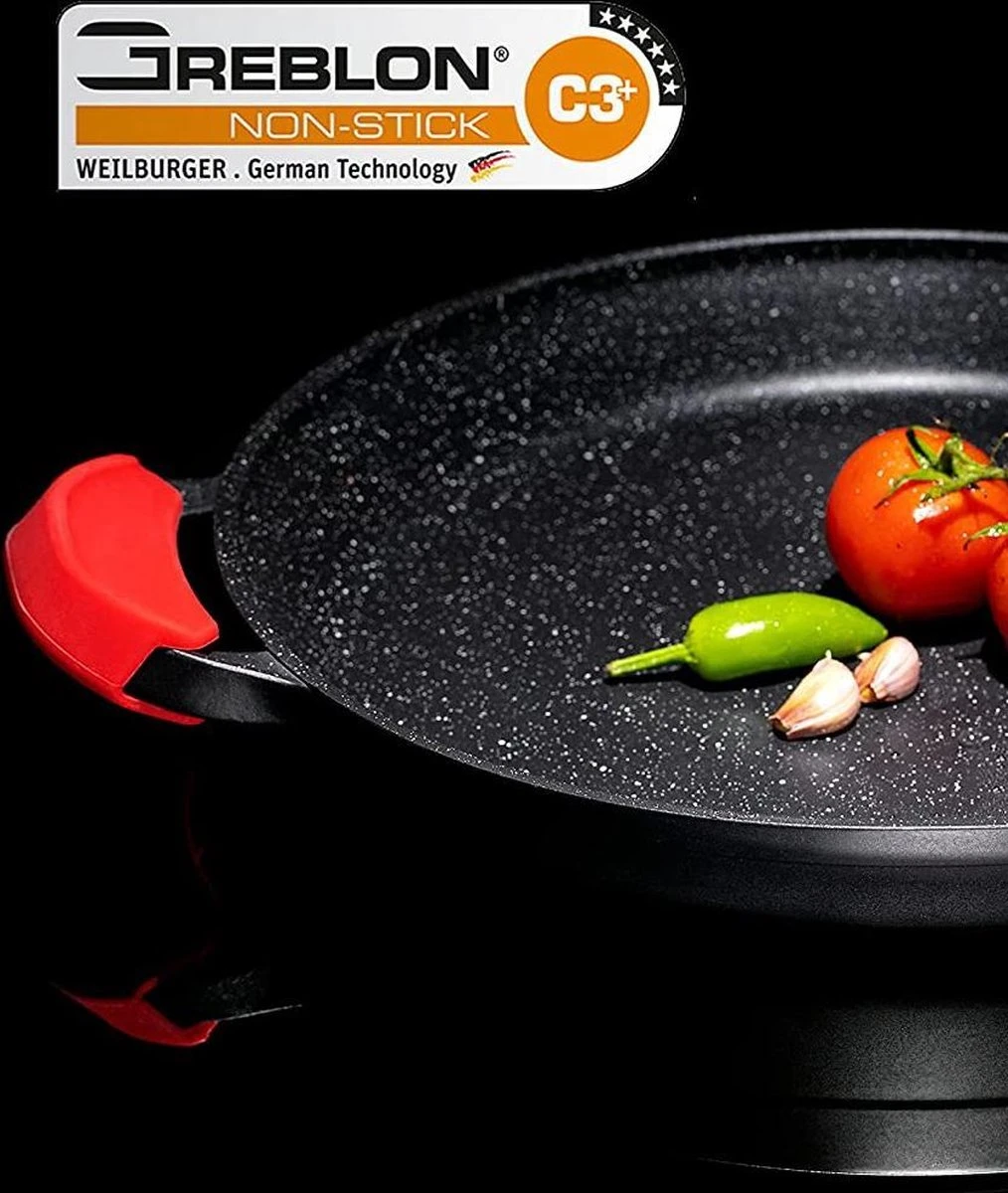 Onze antikleef paellapan is ovenbestendig. Klop uw favoriete gebakken gerechten op in deze aluminium pan zonder dat u zich zorgen hoeft te maken dat de oven het materiaal smelt. Siliconen handgrepen zijn voorzien om Paella direct van kookplaat naar oven naar eettafel te verplaatsen.