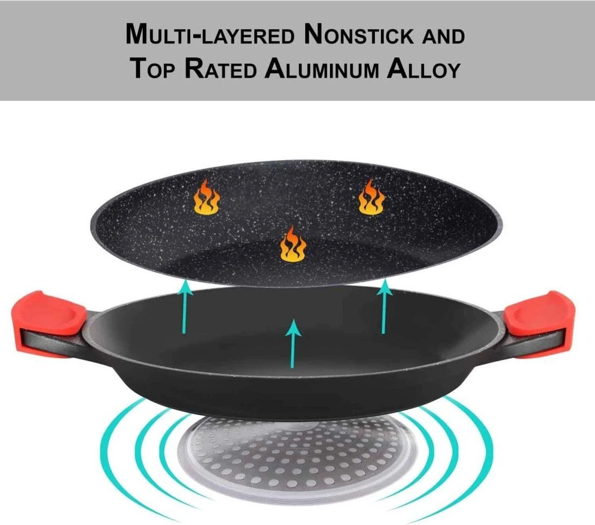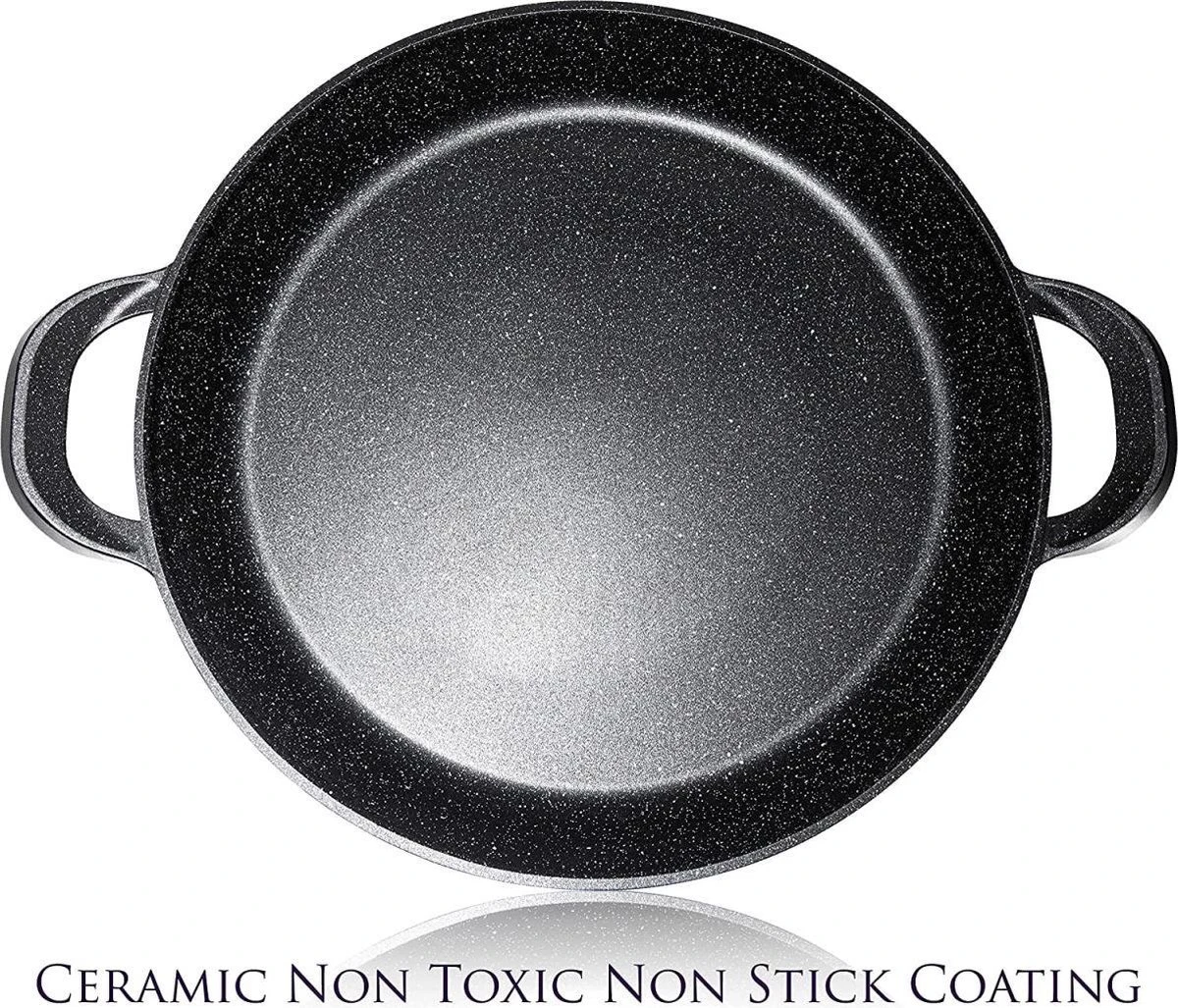 CUILINA grote paella pan 40 cm voor de perfecte paella, gemaakt van robuust gegoten aluminium (lichtgewicht), keramisch versterkte coating aan de binnenkant die nooit zal wikkelen of vastklikken met een antiaanbaklaag die ervoor zorgt dat er geen eten blijft plakken en dat er weinig of geen vet nodig is om er mee te koken.