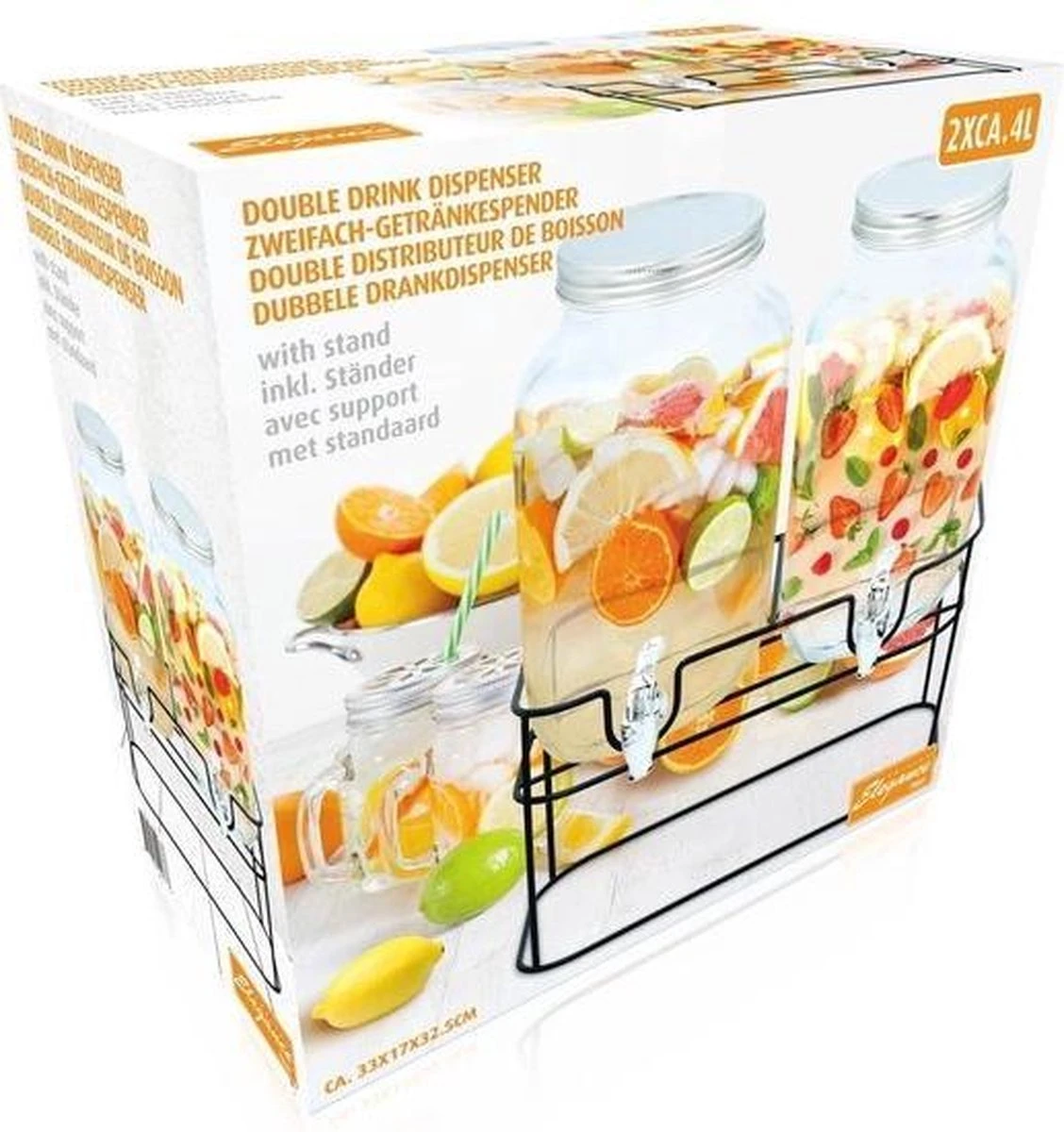 De dispenser tap is gemaakt van glas, het kraantje van chroom waar eenvoudig drankjes uit getapt kunnen worden. De ruime opening bovenaan zorgt ervoor dat je makkelijk ijs, fruit of drank kan toevoegen. Inhoud van de dispenser is ca. 2x 4 liter. Afmetingen ca. 33x17x32,5cm