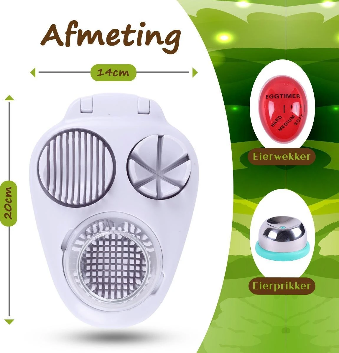 Bij de Dremdo Eiersnijder ontvang je een eierprikker en een eierwekker. Met deze set bereid je altijd een perfect ei. Gebruik de eierprikker om door de schaal heen te prikken, waardoor lucht kan ontsnappen. Dit zal resulteren in het minder snel breken van de schaal tijdens het koken. De eiprikker is geheel veilig omdat het prikkertje is verborgen. Op de eierwekker zitten 3 verschillende standen: hard, medium en soft. Een tijdsberekening voor het perfecte eitje is dus niet meer nodig!