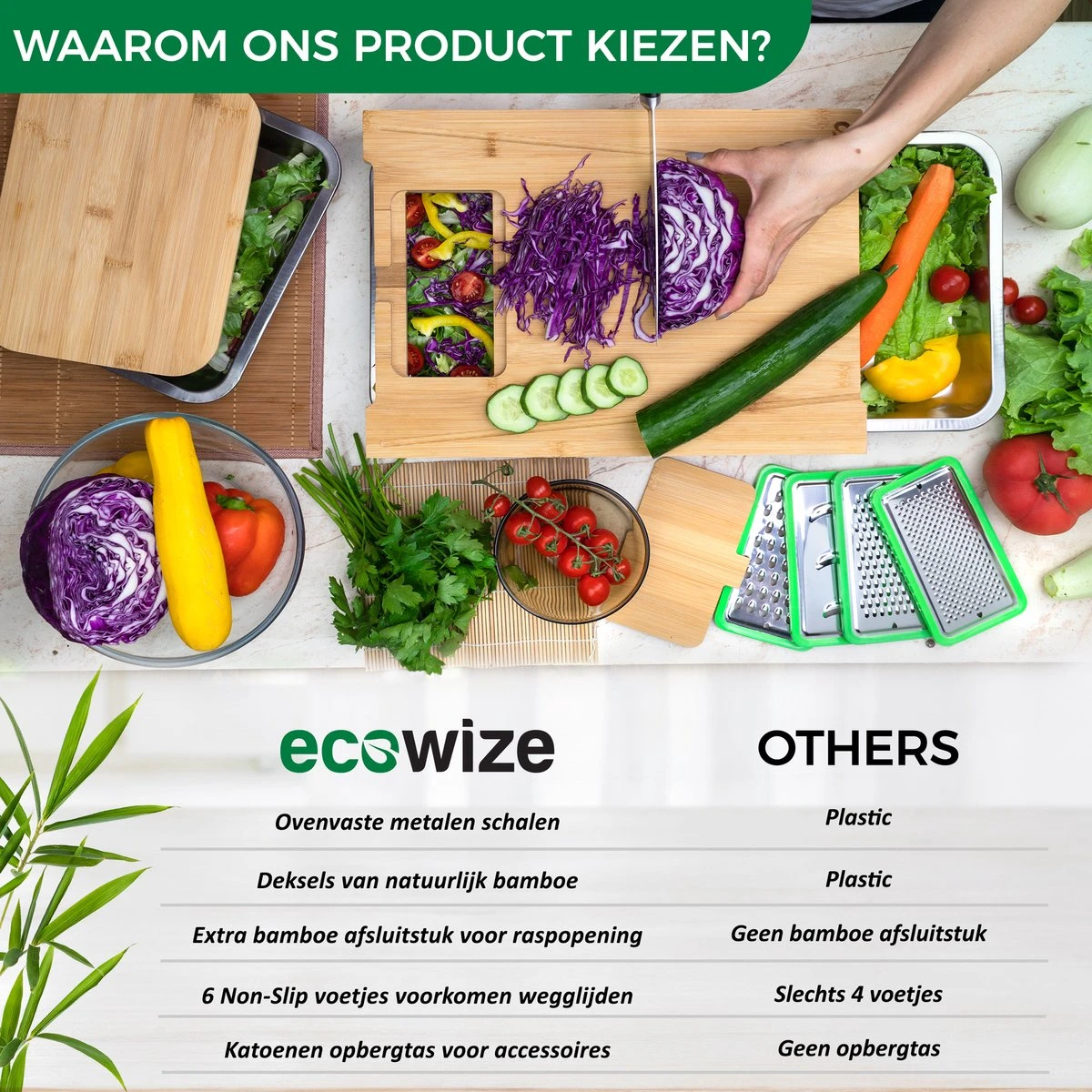 - PRACKTISCH EN MULTIFUNCTIONEEL: Met Ecowize kun je snijden, hakken en raspen – allemaal op slechts één snijplank. Perfect als hakblok of groentesnijder; je verzamelt de gesneden ingrediënten eenvoudig in de opvangschalen, die je vervolgens kunt afsluiten met een deskel en in de koelkast of vriezer bewaren. Of je kunt de roestvrijstalen schalen rechtstreeks in de oven zetten. Gebruik ook één van schalen als afvalbakje. Zo hoef je minder op te ruimen en af te wassen! Ook te gebruiken als broodplank, tapasplank, kaasplank of borrelplank. Een ideaal, duurzaam cadeau voor een verjaardag, bruiloft of nieuwe woning!
