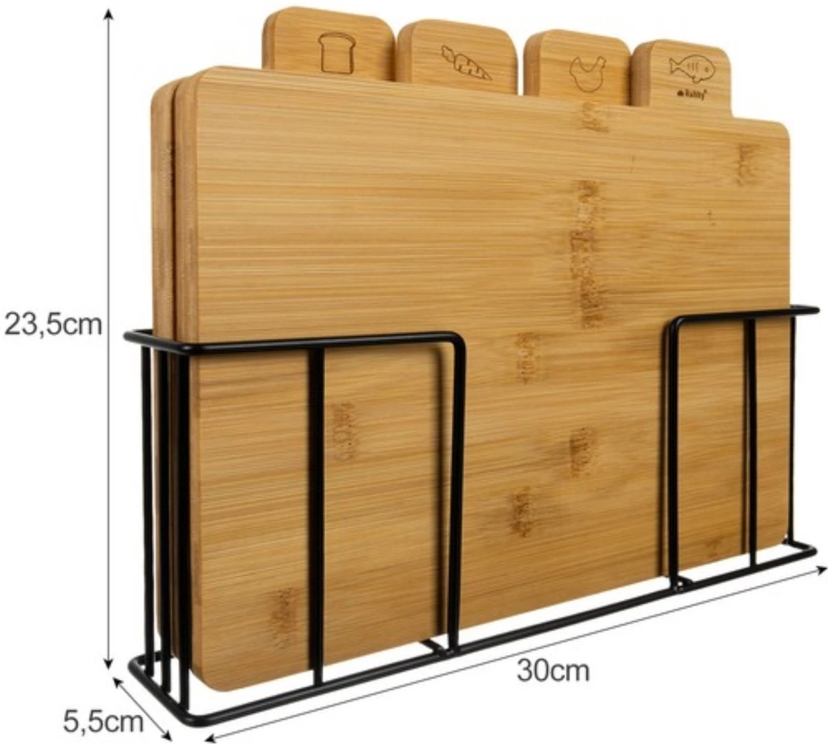 Elefes presenteert de ideale set van 4 Bamboe snijplanken met een stijlvolle matzwarte standaard. Deze set biedt jou extra ruimte in de keuken om maaltijden voor te bereiden, waarbij je gemakkelijk kunt snijden, raspen, schillen of hakken. De planken zijn van duurzaam bamboe en zijn gemakkelijk schoon te maken. Je kunt ze afvegen met een vochtige doek of afspoelen onder stromend water, zonder dat het hout vocht opneemt en er schimmels of bacteriën ontstaan. Het gebruik van natuurlijk bamboe maakt de planken bestand tegen vocht en antibacterieel.