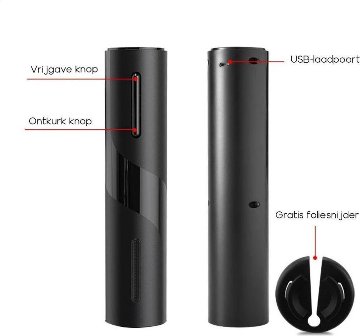 Met deze bijzondere en luxe wijnopener kunt u zonder moeite gemakkelijk wijnflessen ontkurken. De oplaadbare elektrische kurkentrekker is een hele handige gadget voor hem/haar wat het leven een stuk eenvoudiger maakt. Snijdt met de meegeleverde foliesnijder eerst de folie van de wijnfles. Bevestig daarna de elektrische kurkentrekker vast aan de bovenkant van de wijnfles. Druk op de onderste knop van de elektrische kurkentrekker om de kurk automatisch uit de fles te halen en daarna op de bovenste knop om de kurk weer los te halen.