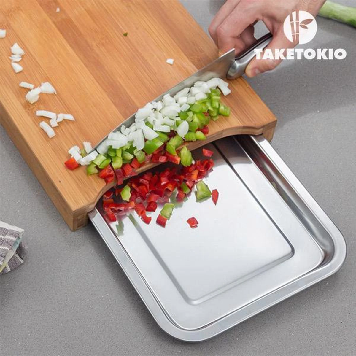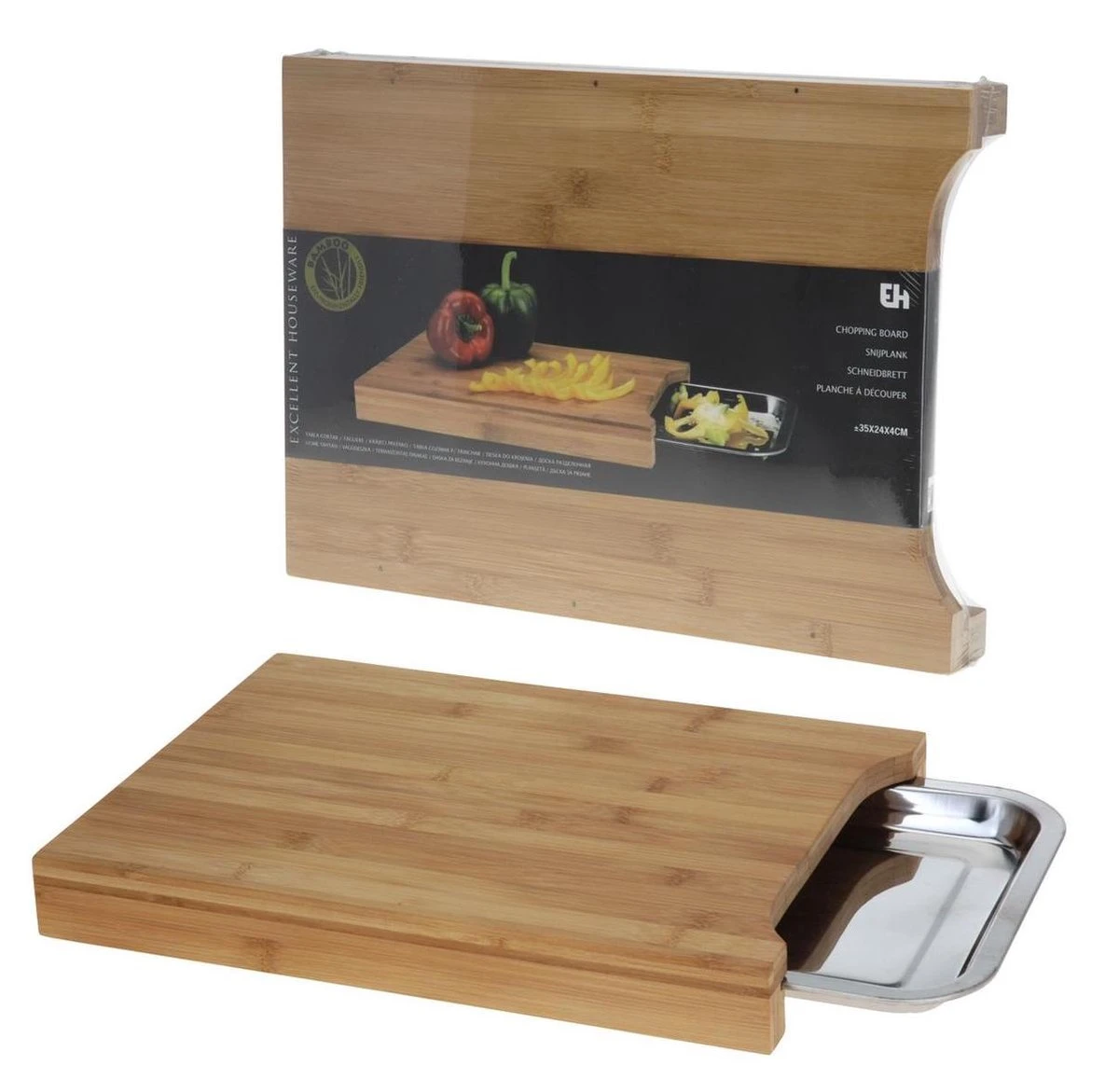 Handige bamboe snijplank met daaronder een RVS opvangbak van het merk Excellent Houseware. Groente snijden en direct in de luxe RVS opvangbak vegen (of juist het snijafval daar in opvangen).