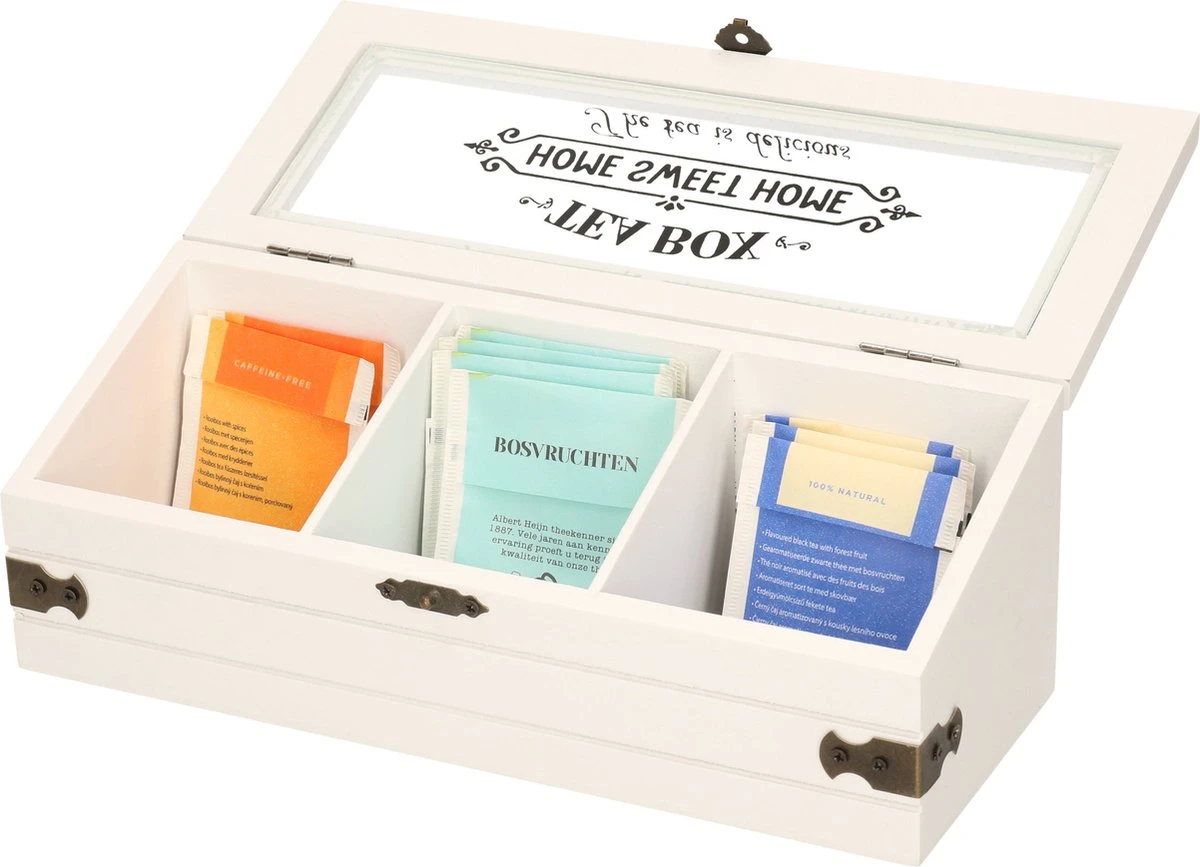 Houten theedoos/theekist wit met mdf bodem met 3 vakken 24 x 9 x 9 cm. Vierkante 3-vaks theedoos voor het bewaren van diverse soorten thee/theezakjes. Met doorzichtig deksel met metalen hoekbeslag, metalen sluiting en de teksten ‘Teabox’ en ‘Home Sweet Home’ en ‘The Tea is Delicious’ op het glazen deksel. De theedoos loopt schuin af van achter naar voren. Afmetingen: 24 x 9 x 9 cm. Materiaal: hout, glas, metaal. Aantal vakjes: 3. Standaard theezakjes passen rechtop in deze theedoos, groter verpakte zakjes kunnen vaak wel schuin in een vakje geplaatst worden.