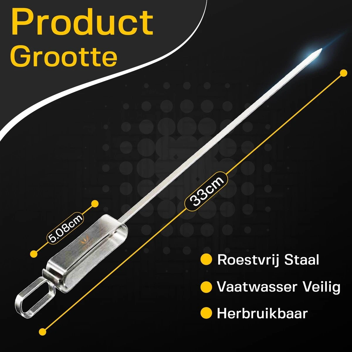 Door het dubbel rechthoekig spies ontwerp blijft het vlees altijd op dezelfde plek liggen wanneer je het omdraait op de barbeque. Hierdoor vallen er geen stukken vlees in je barbecue en is alles snel gaar. Ook zijn de spiezen extra lang waardoor er extra veel oppast
