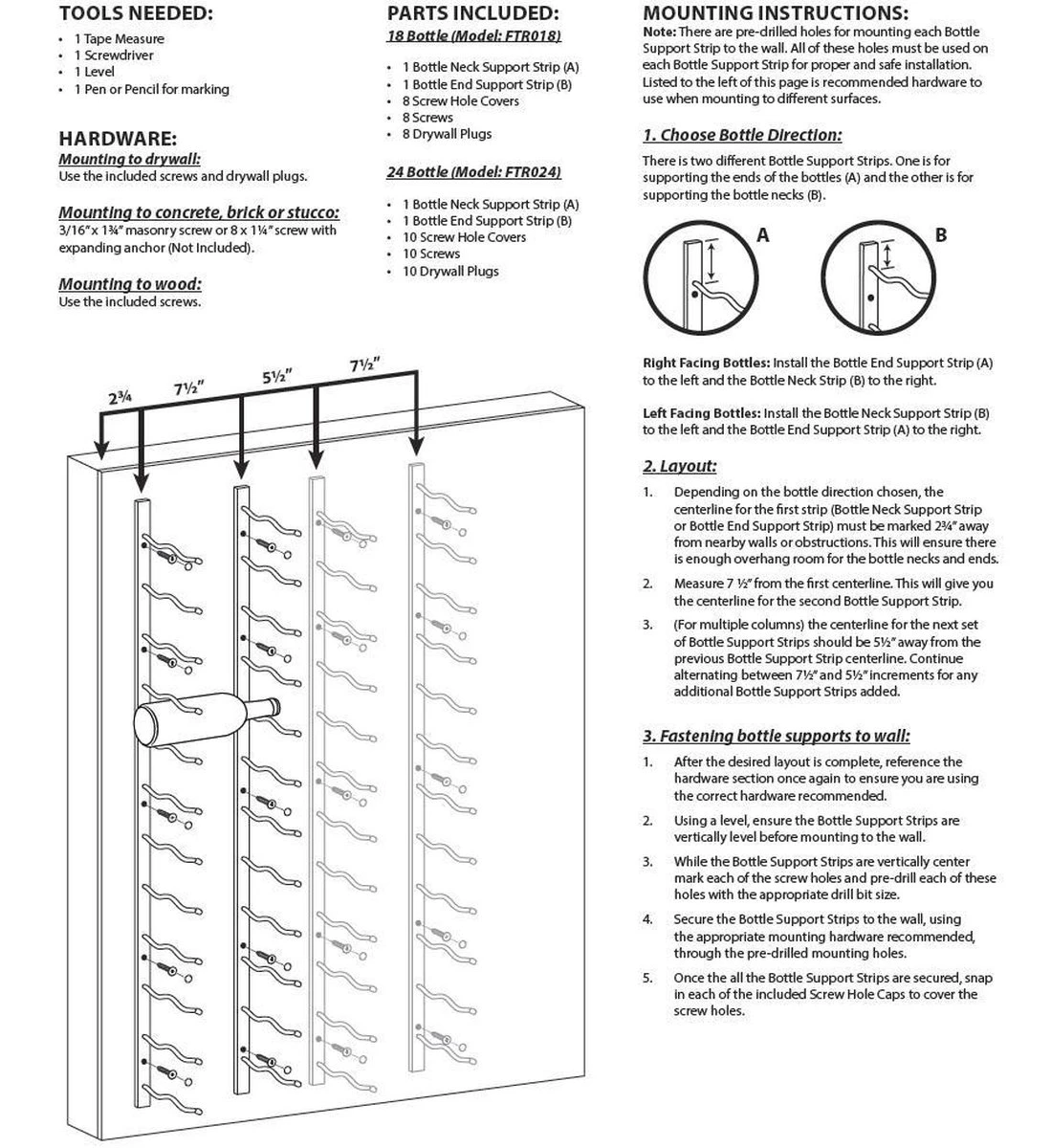 Wijnrek voor 24 flessen, bevestigingsmateriaal, einddoppen en handleiding