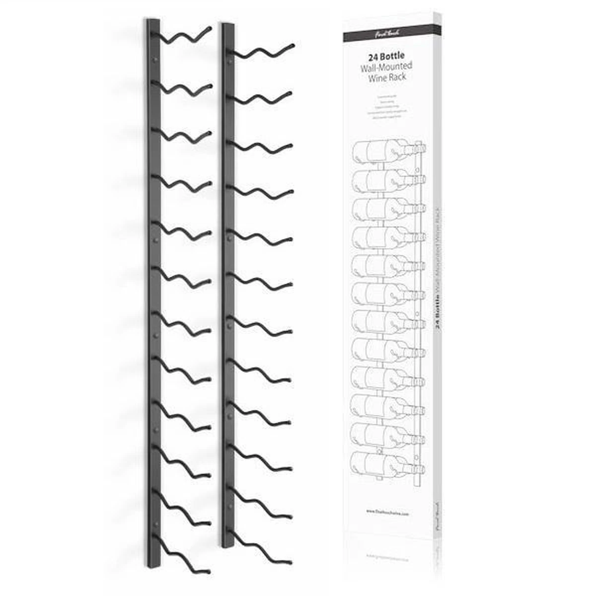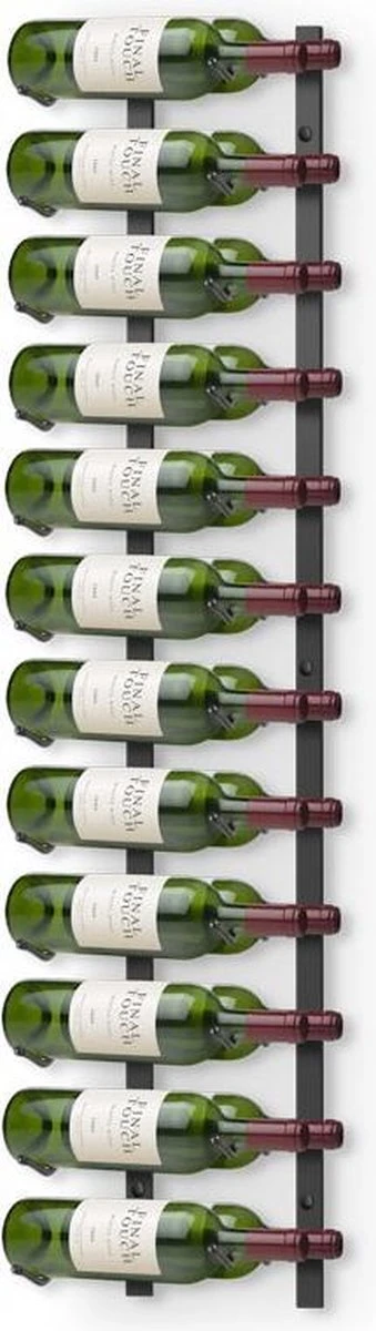 Ruimtebesparend en aan de muur ophangbaar wijnrek dat uw flessen stevig vasthoudt en het label weergeeft. Stevige metalen frame met zwarte poedercoating