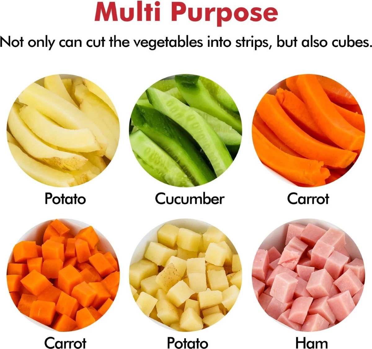 - multifunctioneel: ook handig vooor het snijden van komkommers, wortels, uien, ham etc.