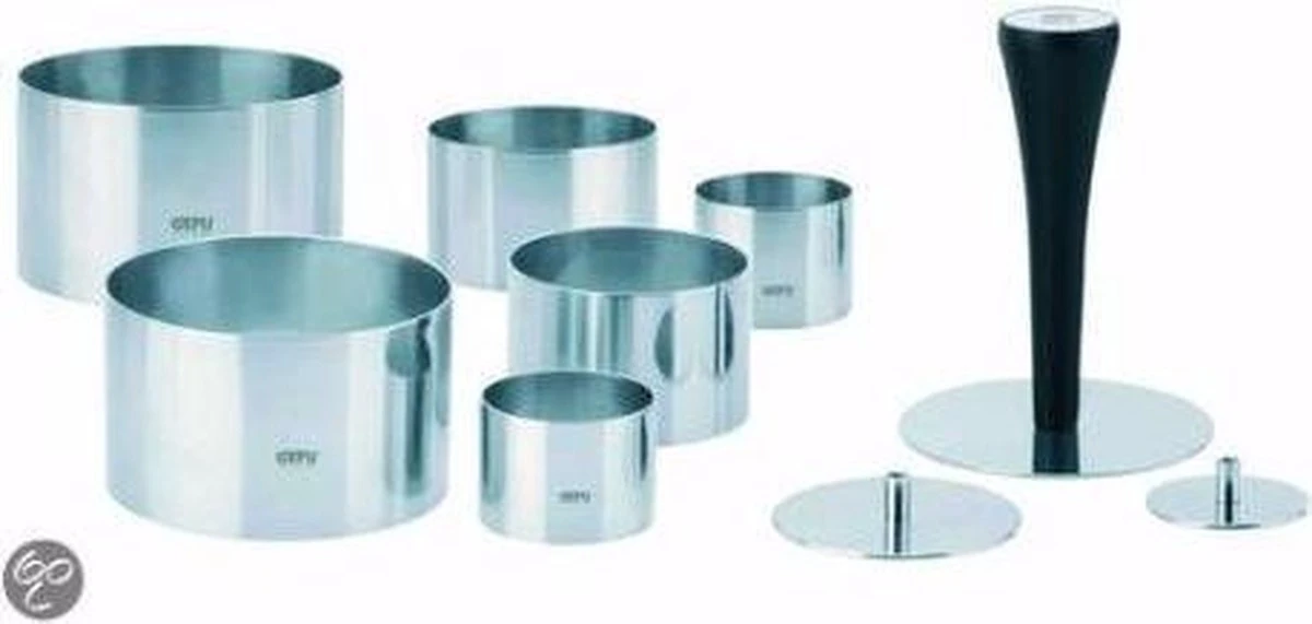 Met de GEFU 10-delige dessertringenset zorg je ervoor dat gerechten echte eye- catchers worden. Ringen in drie verschillende maten om een breed scala van levensmiddelen te snijden, of het nu voorgerechten, hoofdgerechten of desserts zijn. Met een duwer voor elke ringgrootte druk je het voedsel in de ring en komt het er netjes weer uit.