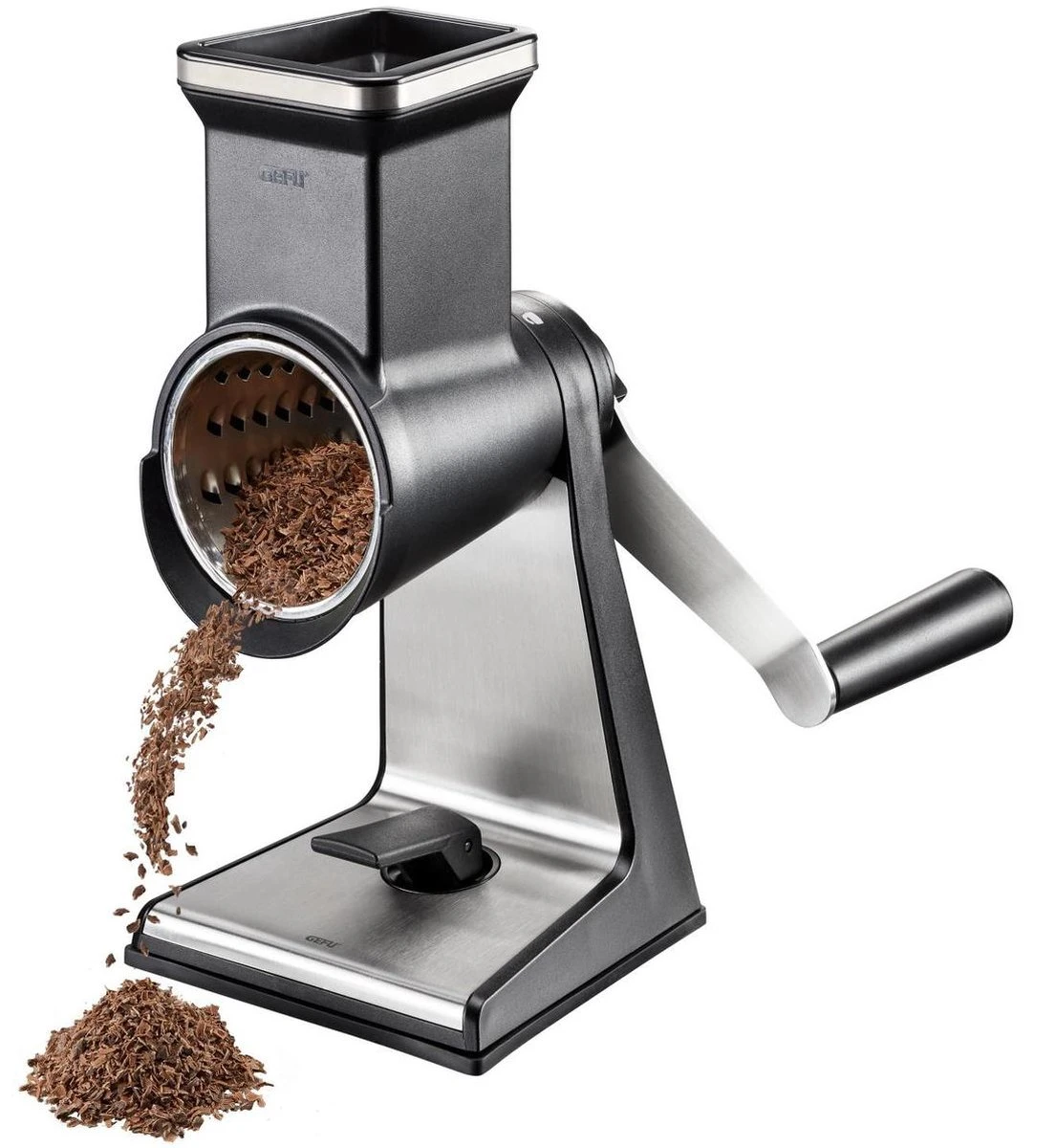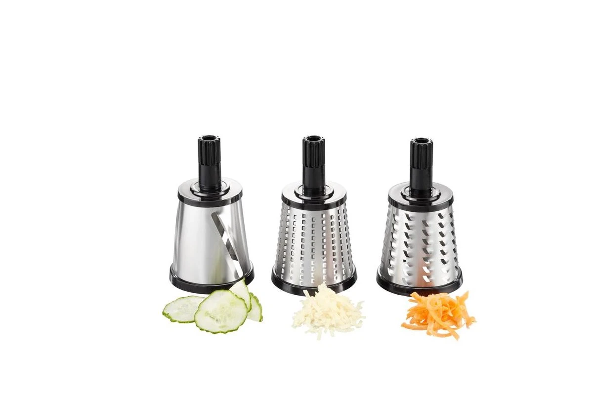 De multifunctionele trommelrasp wordt geleverd met drie extra scherpe trommels voor het verwerken van fruit, groente, kaas, kastanjes, chocolade en noten. De drie trommels zijn bedoeld voor fijne vlokken, ruwe raspels of dunne plakjes. De rasp heeft een hoog voetstuk zodat u hieronder eenvoudig een schaaltje kunt zetten.