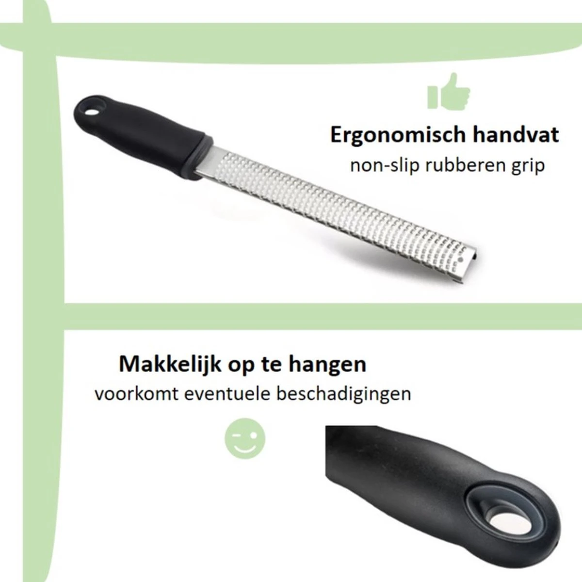 De rasp heeft een comfortabele en ergonomische non-slip rubberen grip dat zorgt voor optimale stabiliteit tijdens het raspen. Het messcherpe bladoppervlak bestaat uit 304 roestvrij staal waardoor deze een langdurige levensduur heeft. Een duurzame en milieubewuste keuze!