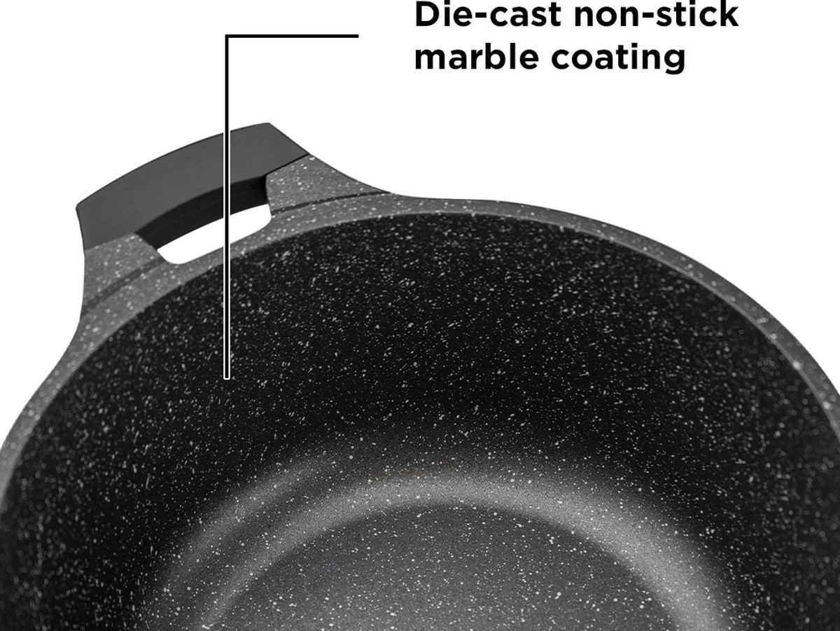De PTFE/PFOA/PFOS-vrije anti-aanbak kookpotten zijn voorzien van een duurzame anti-aanbaklaag voor het gemakkelijk losmaken van voedsel, schoonmaken en gezond koken met een hittebestendige lak aan de buitenkant die bestand is tegen hoge temperaturen. Deze pannen en braadpannen zijn veilig voor gebruik op gas, elektrisch, keramisch en inductie.