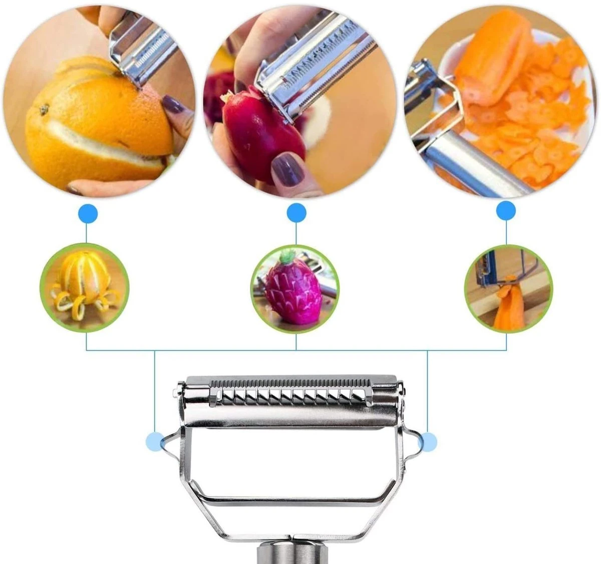 - Voordeel mes: de multifunctionele dunschiller is een uniek 2-in-1 dunschiller keukengereedschap voor schillen en hakken, gebruikt om mooie decoratieve strips, gekartelde fruit- en groenteschilmessen te maken.