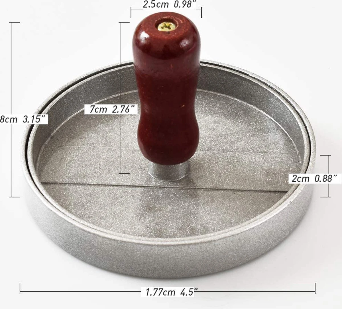 - Precies de juiste maat – met een binnendiameter van 11,5 cm en een vormhoogte van 2 cm creëer je perfecte burgerporties op het gebied van vorm, grootte en gewicht. Hij heeft de perfecte maat voor standaard hamburgerbroodjes. Dankzij de overzichtelijke afmetingen kan de pers probleemloos bijvoorbeeld in een lade worden bewaard en neemt zo weinig ruimte in de keuken in.