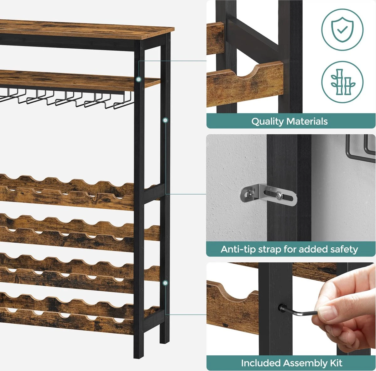 [What You Get] Een ruimtebesparend wijnrek met 24 flessen met glazen houders en een tafelblad; plus anti-kantelbescherming, duidelijke instructies voor eenvoudige montage en de mogelijkheid om uw wijncollectie in stijl te presenteren