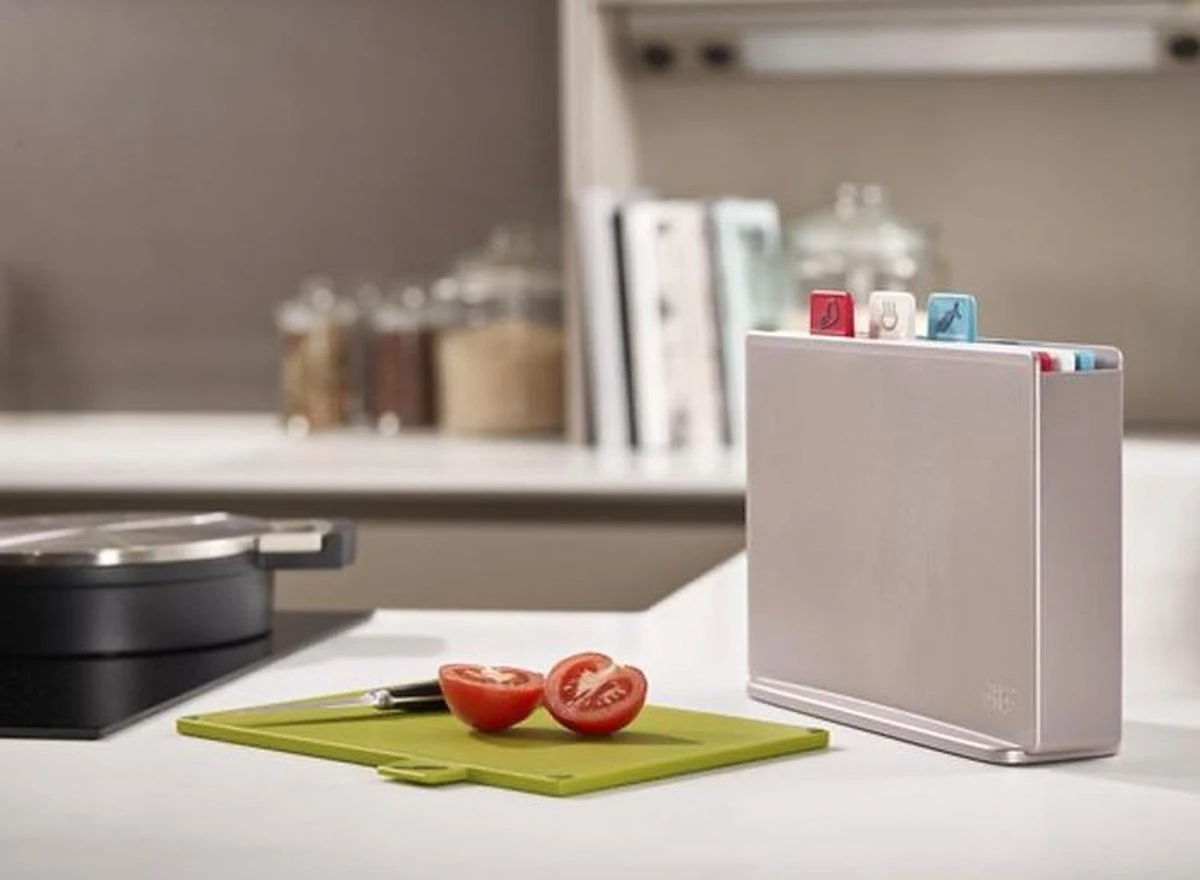 De vernieuwde Index heeft dezelfde eigenschappen als de laatste variant. Alleen de houder heeft een vernieuwd ontwerp. Net als bij de voorgaande Index hebben de snijplanken een opstaande rand om vocht of kruimels op te vangen en antislip hoekjes. Ook de houder heeft een antislip bodem.