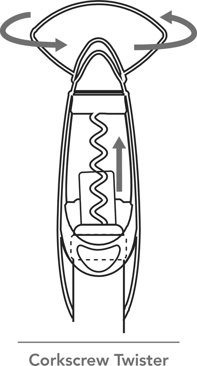 Het speciaal ontworpen frame van de Corkscrew Twister omvat een unieke “Bottle Grip”, waardoor de kurkentrekker zich vastzet op zowel standaard wijnflessen als wijnflessen voorzien van een flens. Plaats de kurkentrekker op de hals en draai de spiraal tot de fles is ontkurkt.
