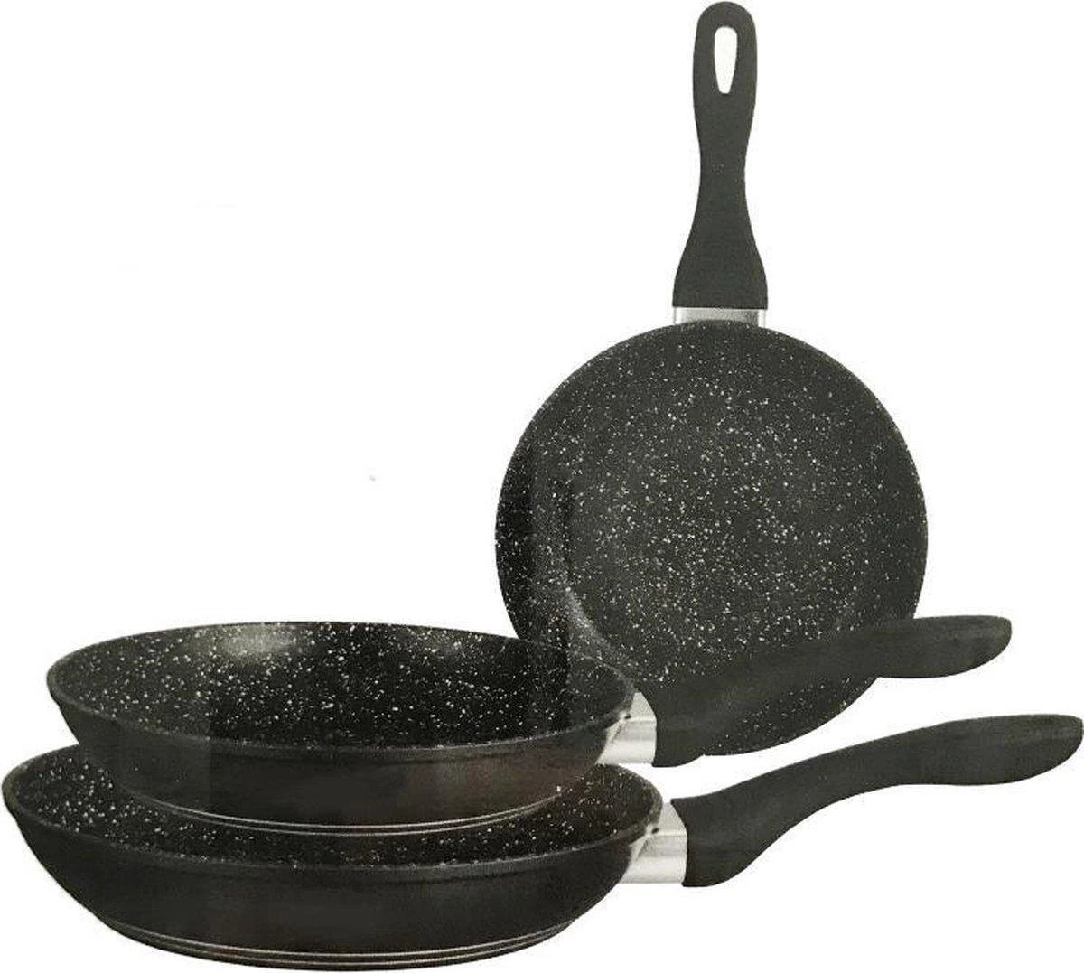 Koekenpannenset in nature-look. Afmetingen: 20 cm, 24 cm en 28 cm. Met anti-aanbaklaag, geschikt voor olie-vetvrij koken. Geschikt voor alle warmtebronnen inclusief inductie.