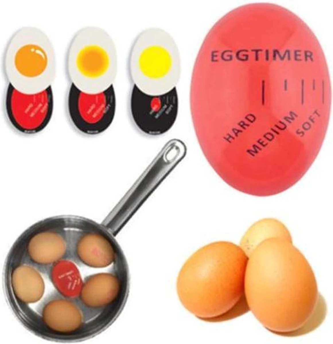 Leg de ei timer samen met de eieren in een pan met water. Zet het vuur aan en let op de kleur verandering. Zo heb je altijd het perfecte ei.