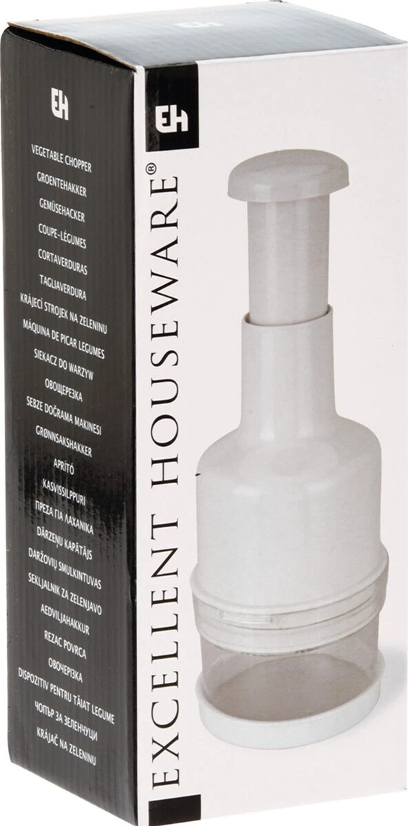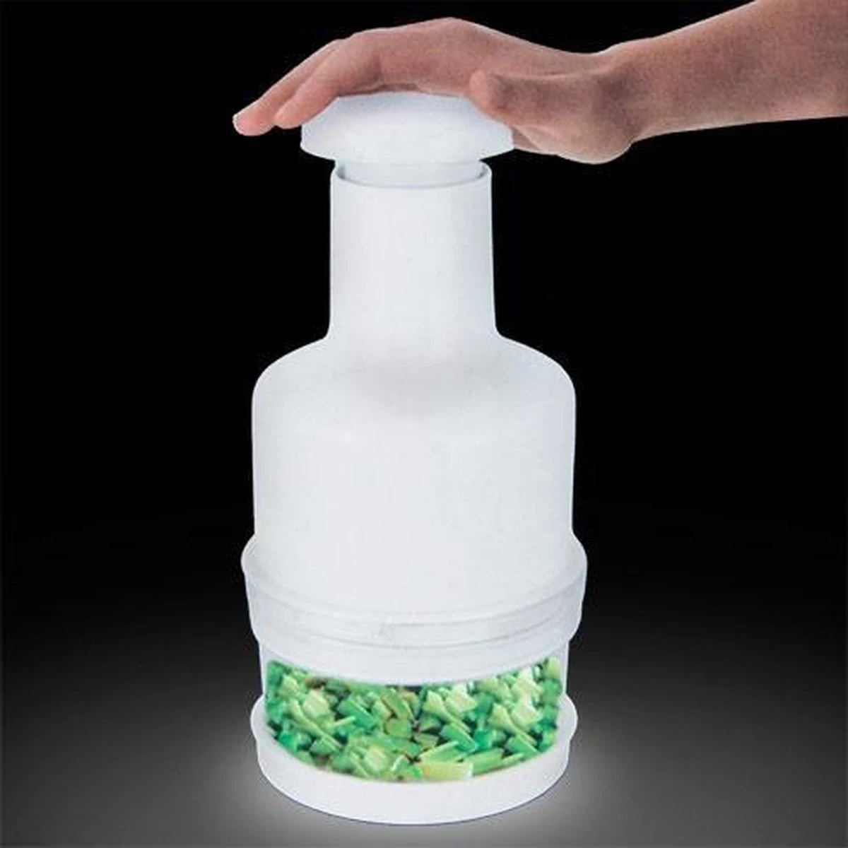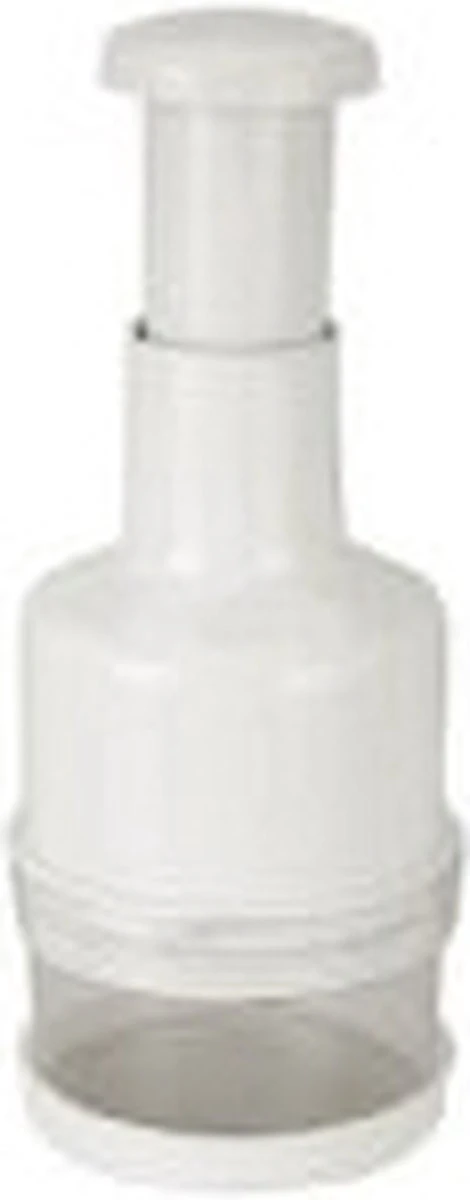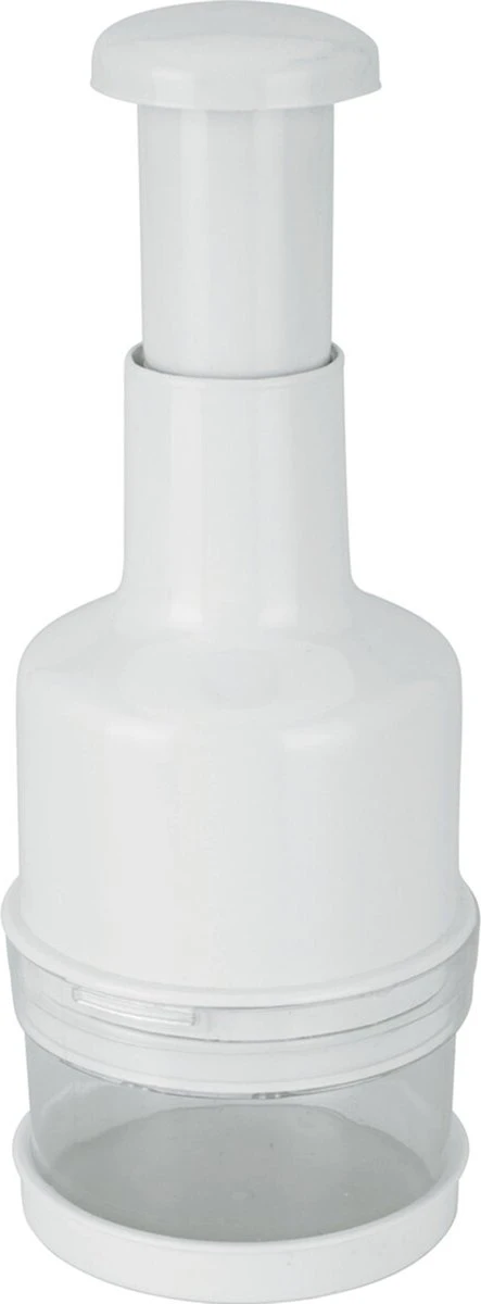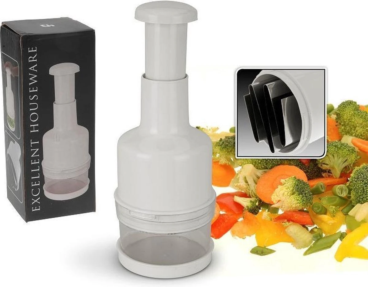 Dit is de manuele groentehakker! Je kan hem gebruiken voor het snijden en hakken van groenten veel makkelijker te maken. Druk de bovenkant naar beneden en de bladen aan de binnenkant zullen automatisch gaan draaien en de groenten versnijden. De manuele groentehakker is gemaakt van resistente plastic en roestvrij stalen bladen. Hij neemt erg weinig ruimte in beslag, is lichtgewicht en erg makkelijk schoon te maken. Geschatte afmetingen: 22 cm hoog x 8 cm diameter.