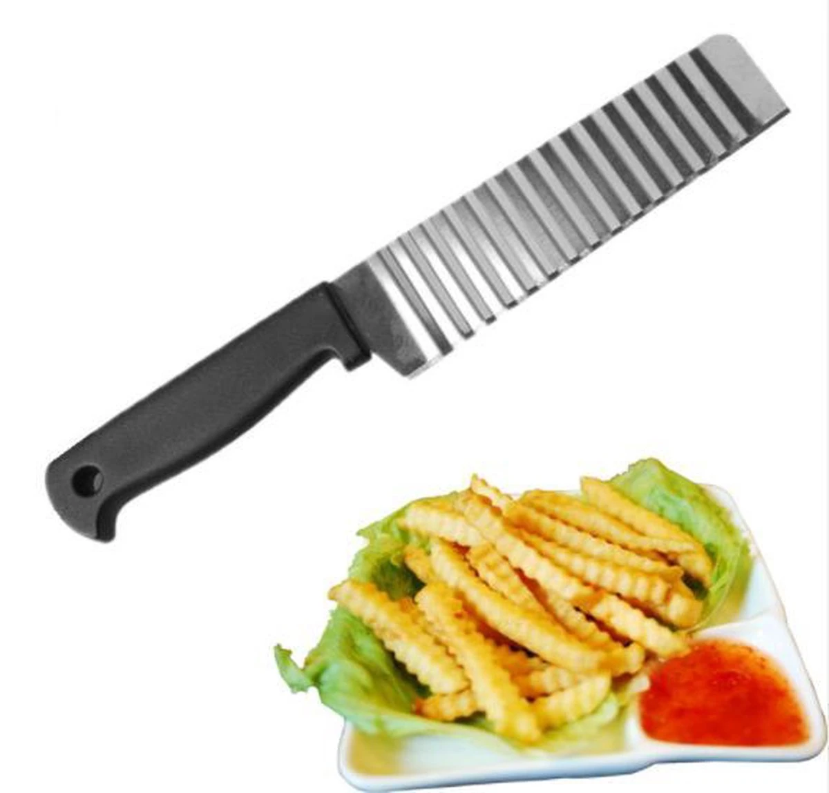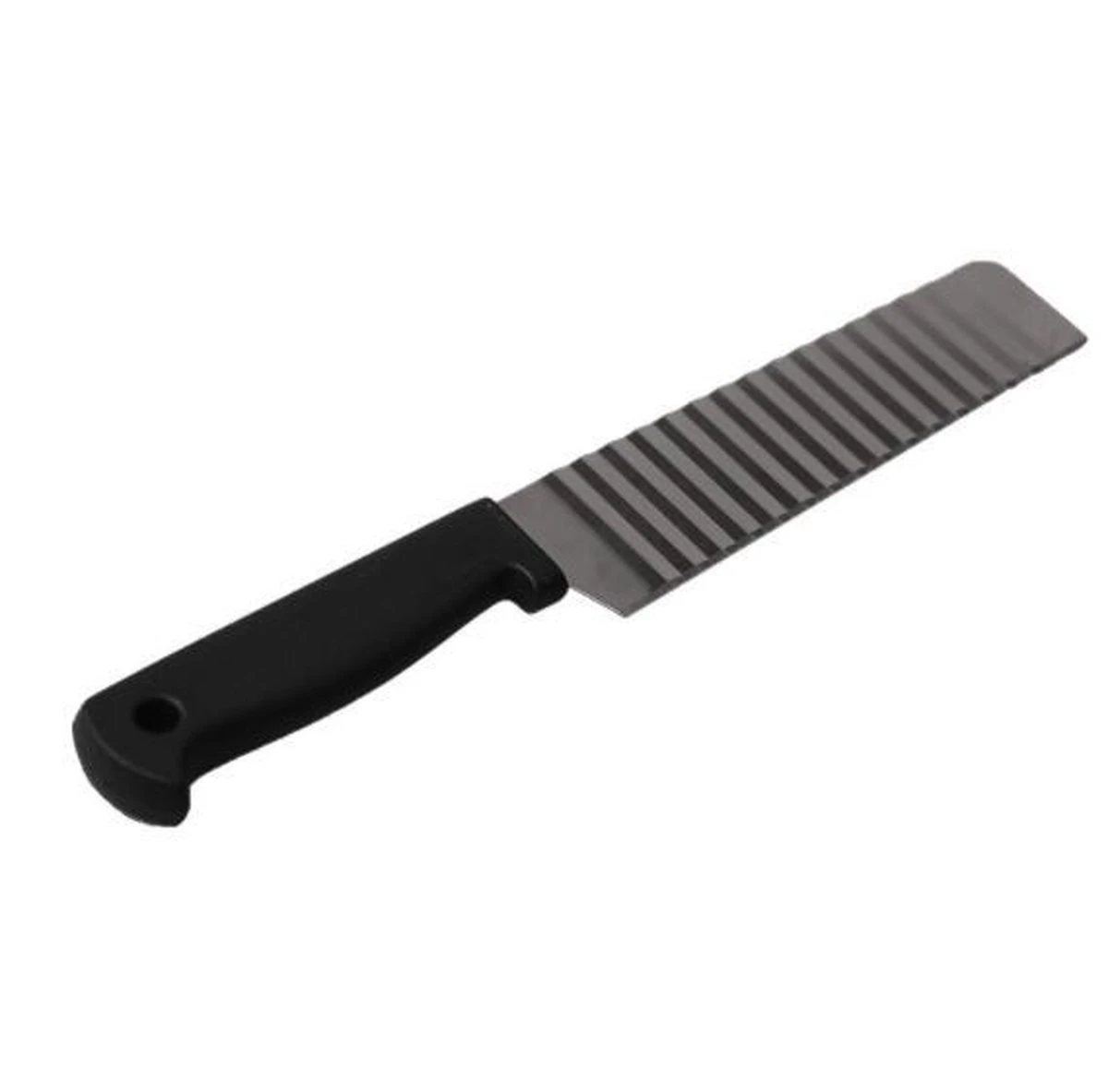 Met dit multifunctionele kartelmes kunt u voortaan heerlijke plakjes, blokjes of staafjes groenten, chips & frieten snijden in zig-zag formaat. Het golvende ontwerp zorgt niet alleen voor een stijlvolle indruk van uw gerechten, maar geeft bijvoorbeeld frietjes ook meer smaak omdat ze over een groter oppervlakte gebakken worden.