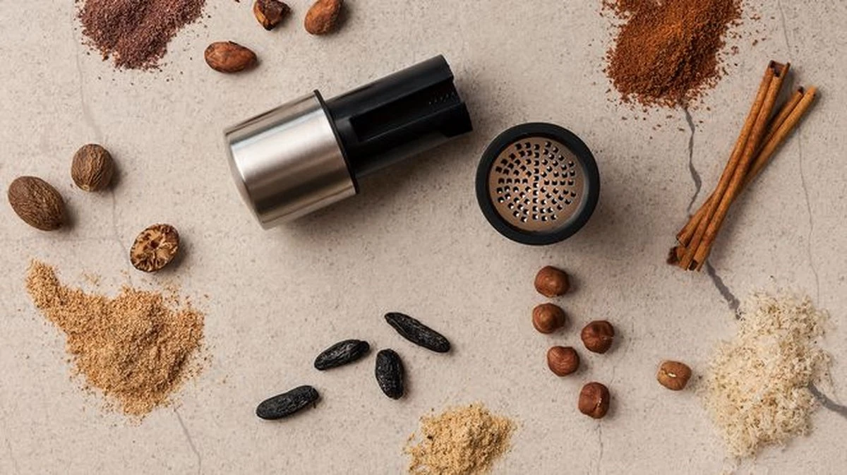 Met deze nootmuskaatmolen van Microplane worden de noten helemaal opgeraspt. Aan de bovenzijde van de rasp kunnen een paar noten bewaard worden. Ook andere harde specerijen zoals kaneel kan er mee geraspt worden.