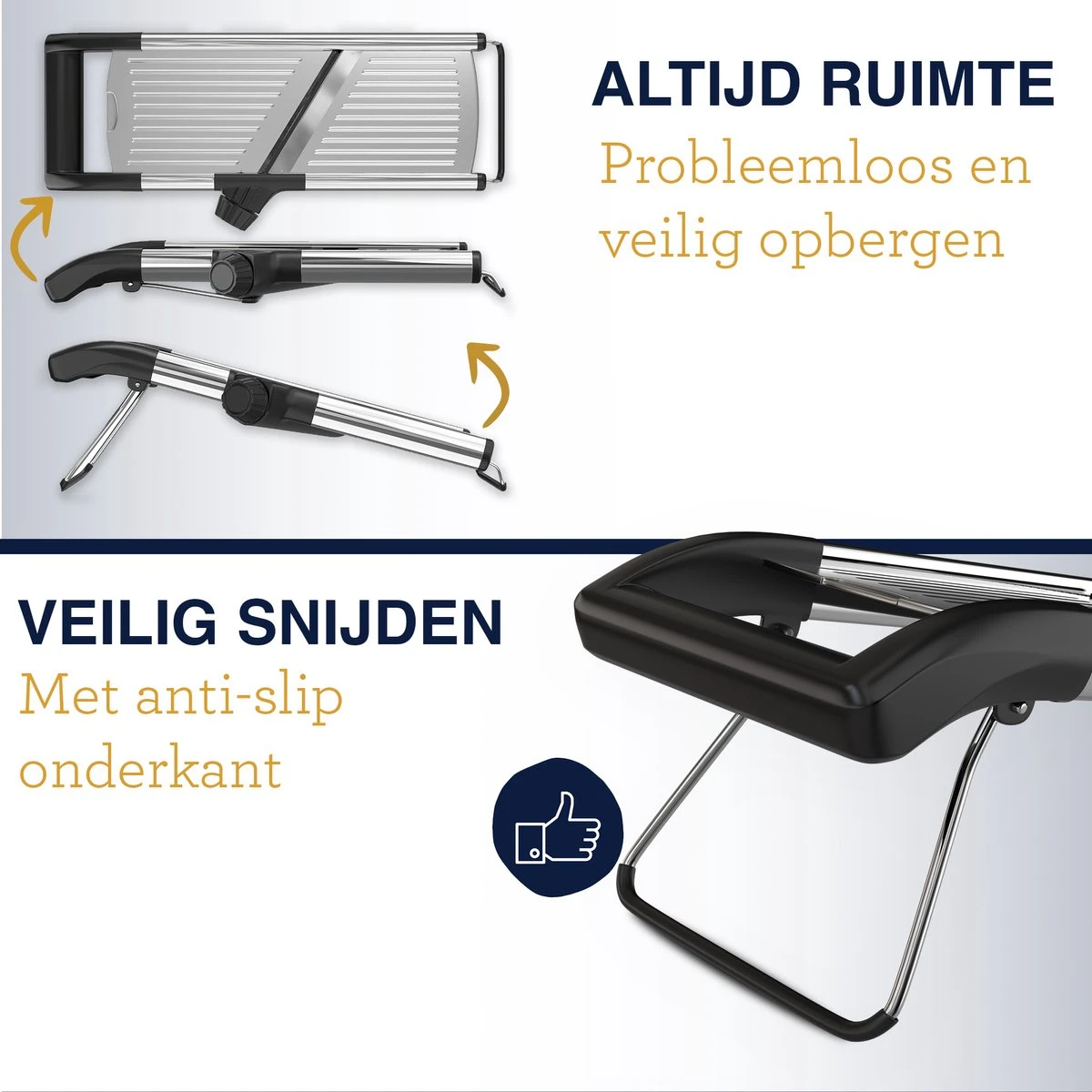 Kleine keuken? Geen probleem. Klap de bijgeleverde standaard simpelweg in en jouw mandoline past overal in.