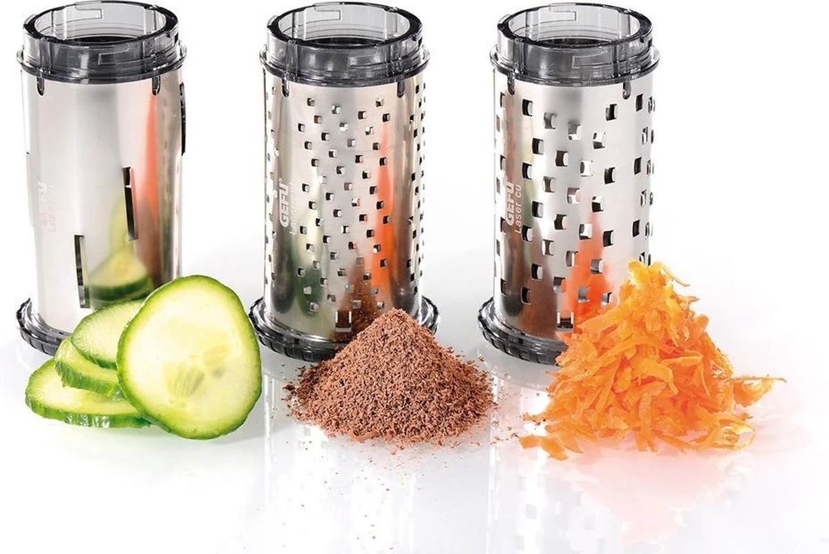 Multifunctionele rasp ‘Laser Cut’ van Gefu. De rasp heeft drie verschillende messen, geschikt voor kaas, groentes en chocolade. 1. Slicer: voor het raspen van dunne plakjes. 2. Coarse: grove rasp. 3. Fine: fijne rasp. De roestvrijstalen verwisselbare messen zijn zeer scherp. De rasp is geschikt voor allerlei groentes, harde kazen zoals parmezaan, en voor chocolade. Geschikt voor zowel linkshandig als rechtshandig gebruik doordat het hendel aan beide kanten van de rasp geplaatst kan worden. Alle onderdelen zijn geschikt voor de vaatwasmachine.