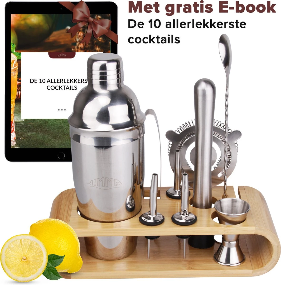 Alle losse onderdelen van een cocktail set kopen kost veel te veel tijd, daarom is de Nimma cocktailset perfect! Alles wat je nodig kan hebben op 1 centrale plek. De set bestaat uit een cocktailshaker, een maatbeker, een menglepel, een stamper, een zeef, een ijstang, 3 schenktuitjes en een houten opbergrek!