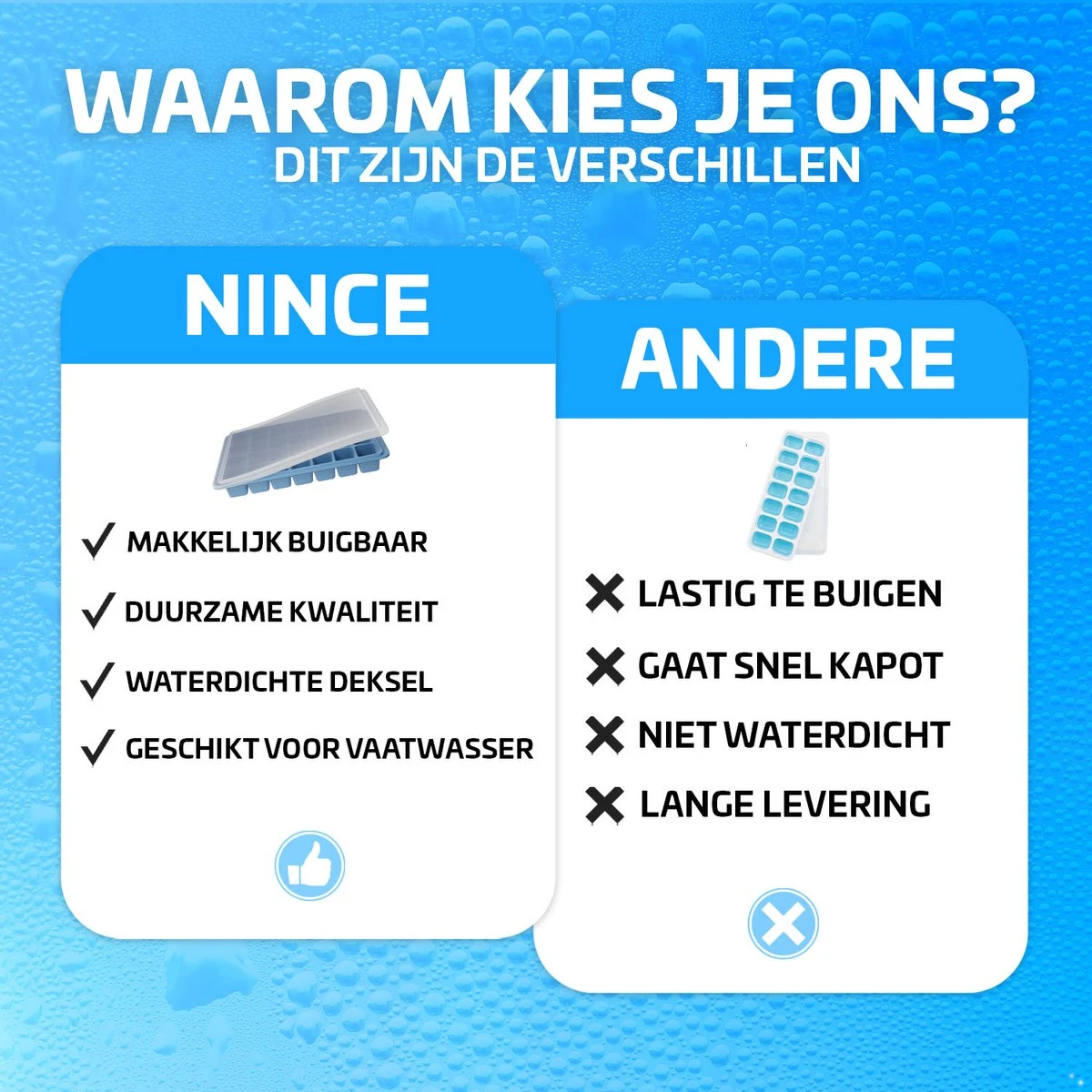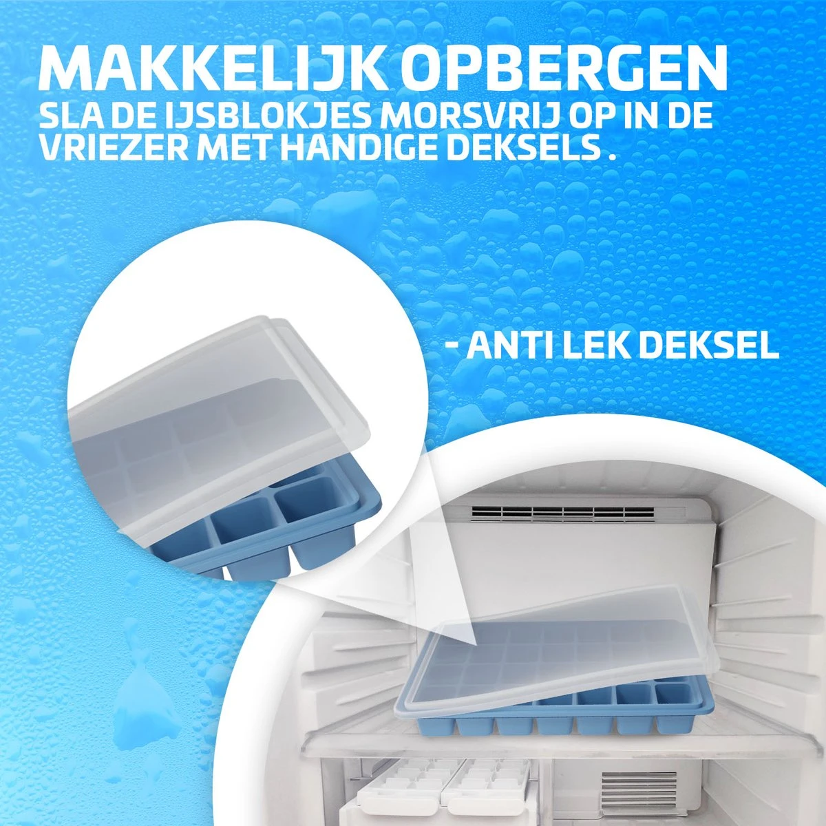 Met de silicone deksel hou je het water gemakkelijk op zijn plek. De opstaande rand om de ijsblokjesvorm zorgt ervoor dat de deksel niet aan de ijsblokjes vastplakt. Je kunt de deksel eenvoudig verwijderen nadat de ijsblokjes gereed zijn.