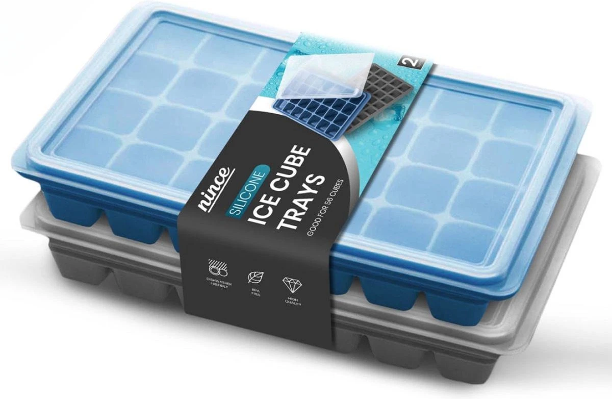 Met de Nince ijsblokjesvorm ben jij altijd voorzien van de koudste ijsblokjes. De siliconen ijsblokjesvorm is buigzaam, BPA vrij, en wordt verkocht als set van 2 (48 ijsblokjes). De ijsblokjesvorm is vaatwasbestendig en heeft een deksel waarmee je het water op de juiste plek houd.