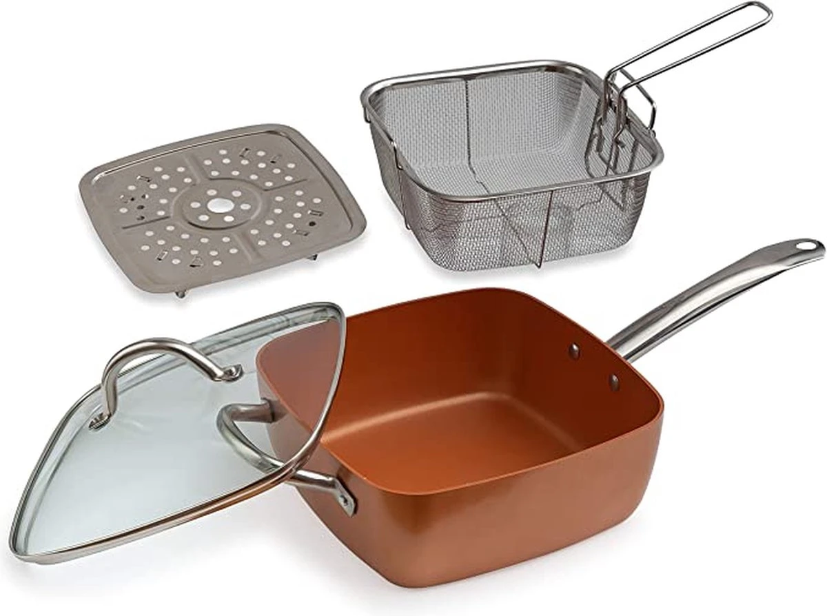 Deze verbluffende grote diepzijdige vierkante frituur-set is gemaakt uit koper van hoogwaardig aluminium, verwarmt snel zonder de nood voor olie, zodat u handige gezonde maaltijden kunt bereiden die je met het hele gezin van kan genieten.