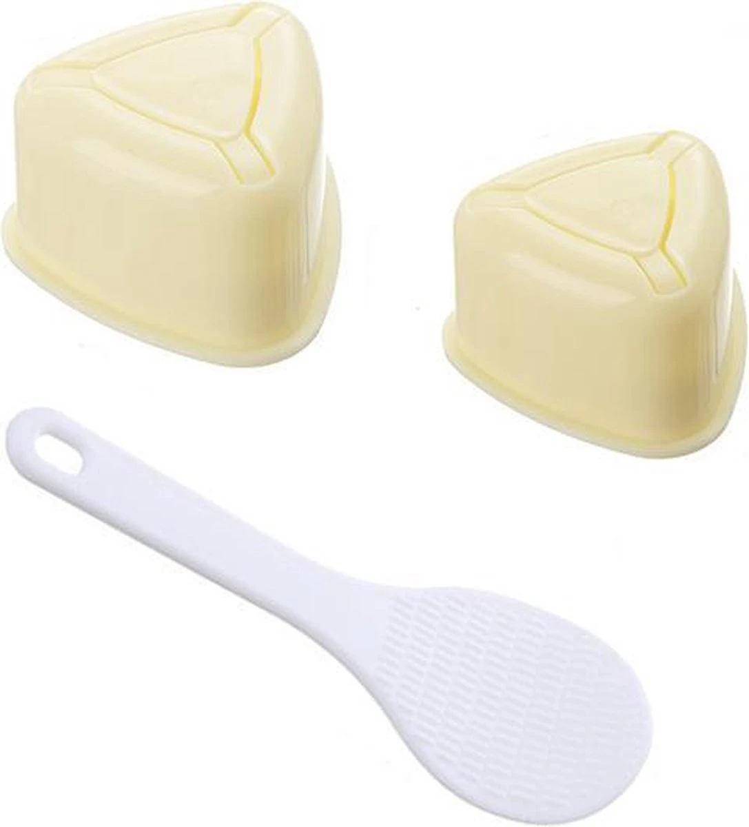 Dit product bestaat uit 2 driehoekige onigiri sushi vormen: 1 medium en 1 groot – met afsluitdeksel en 1 Lepel