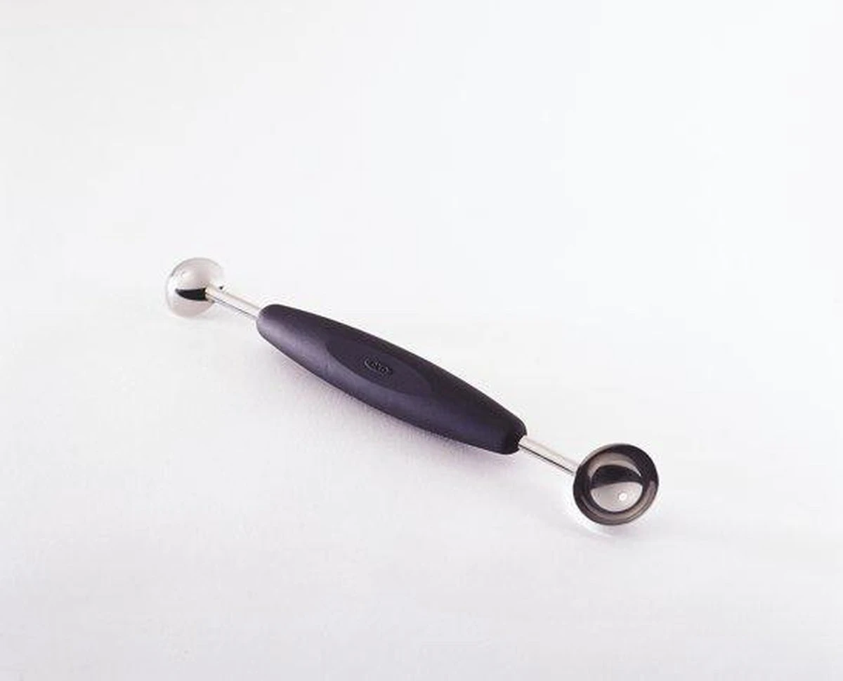 De OXO Good Grips Meloenschep heeft twee roestvrijstalen schepjes waarmee meloenbolletjes in verschillende maten gemaakt kunnen worden. De zachte, smalle greep ligt comfortabel in de hand en maakt het makkelijk om de meloenschep te draaien als je beide schepjes gebruikt. Onze Meloenschep is perfect voor fruit salades en garneringen, en is ook handig als je kleine kleurrijke ijsbolletjes wilt maken voor een feestelijk dessert.•2 verschillende maten schepjes