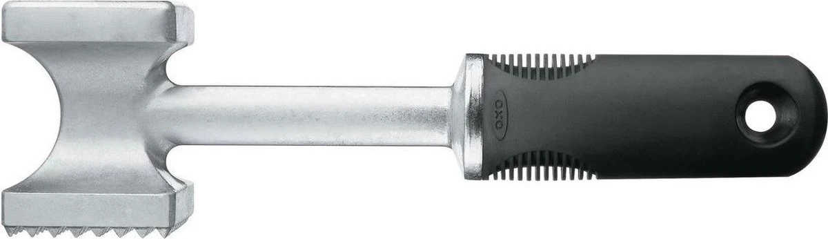 Deze tweezijdige OXO Vleeshamer is een onmisbaar item. Of u nu een goede schnitzel, carpaccio of uw vlees malser wilt maken? Het kan allemaal met deze OXO vleeshamer. De hamer heeft twee kanten. De ene kant heeft een vlakke zijde die perfect is om vlees te pletten voor schnitzels of carpaccio. De andere kant heeft een geprofileerd oppervlak waardoor het vlees weer goed mals geslagen kan worden. De hamer is gemaakt van solide aluminium en de handgreep van santoprene wat een sterk soort kunststof is. De greep voelt zacht aan waardoor het ook de hand ondersteunt en druk absorbeert.