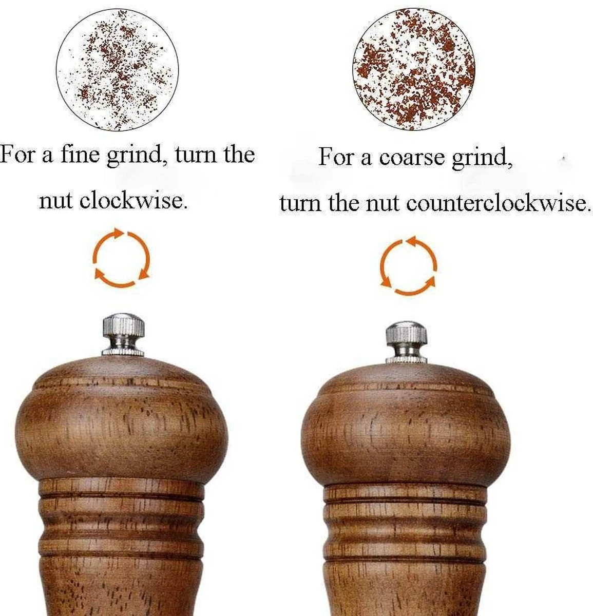 - Instelbaar maalmechanisme: industriële peper- en zoutstrooier met instelbare keramische maalkern, u kunt de maalgraad daarin eenvoudig aanpassen van fijn naar grof door de bovenste moer te draaien. (tegen de klok in voor grofheid, met de klok mee voor fijnheid).