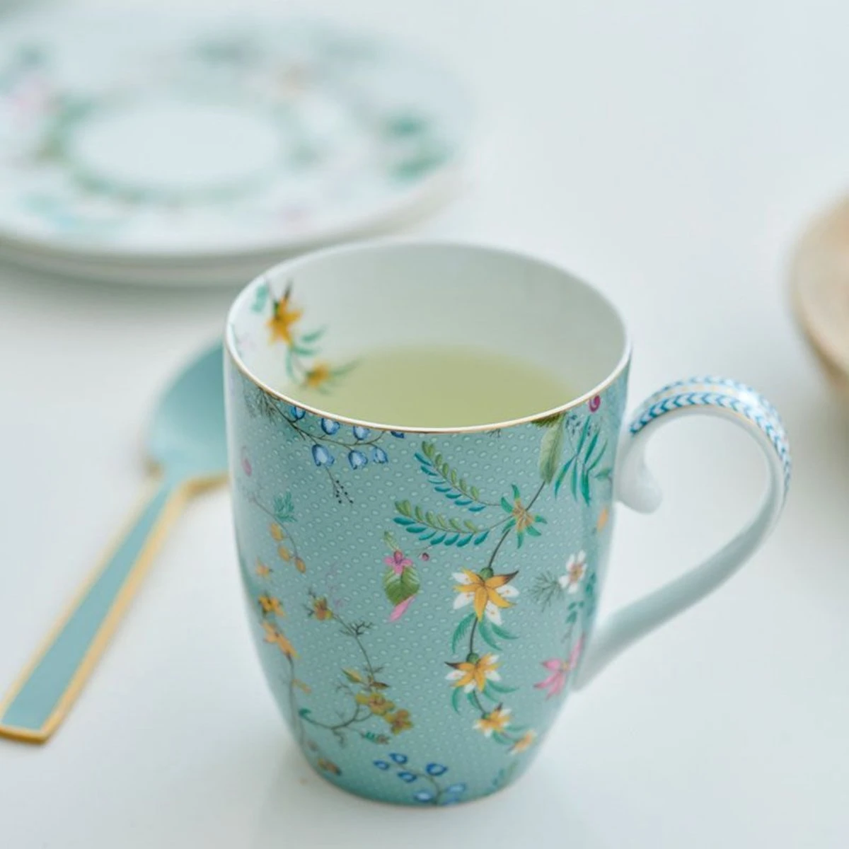 Een set van twee grote mokken uit onze tropische Jolie-collectie. Deze mooie mokken hebben een blauwe achtergrond met kleurrijke bloemen. Waan je op een tropisch eiland en bekijk de tropische planten die op deze mokken zijn gedecoreerd. Perfect om uw serviesgoed mee op te fleuren. De handvatten van de mokken zijn versierd met elegante blauwe details. Combineer deze mokken met andere porseleinen items uit de Jolie-collectie voor een mooie look.